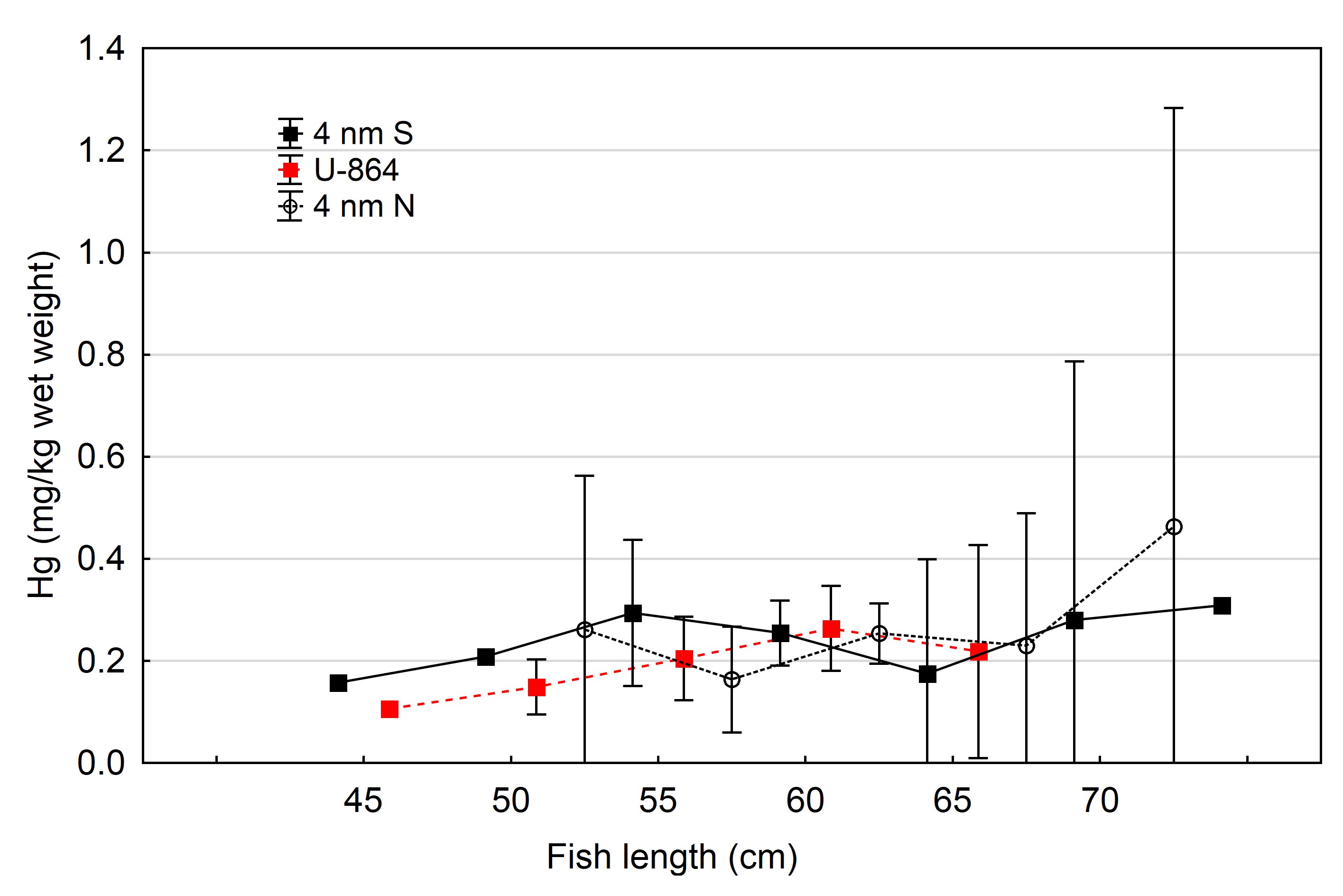 Som vist i rapporten for 2016 (Frantzen m.fl., 2018), var kvikksølvnivået i brosme fisket i området rundt U-864 på nivå med brosme fisket andre steder langs kysten av Vestlandet, i åpent hav i Nordsjøen og Norskehavet, og betydelig lavere enn i brosme fisket i fjorder på Vestlandet. Det er altså ikke noe som tyder på at brosme fisket ved vraket av U-864 har forhøyet kvikksølvnivå som følge av forurensning fra vraket. Dette stemmer godt med resultatene fra en ny publikasjon som viser at isotopsammensetningen til kvikksølvet i brosmer fisket ved U-864 i 2015 er lik den i brosme fra Skagerrak og Sognefjorden (Rua-Ibarz et al. 2019).