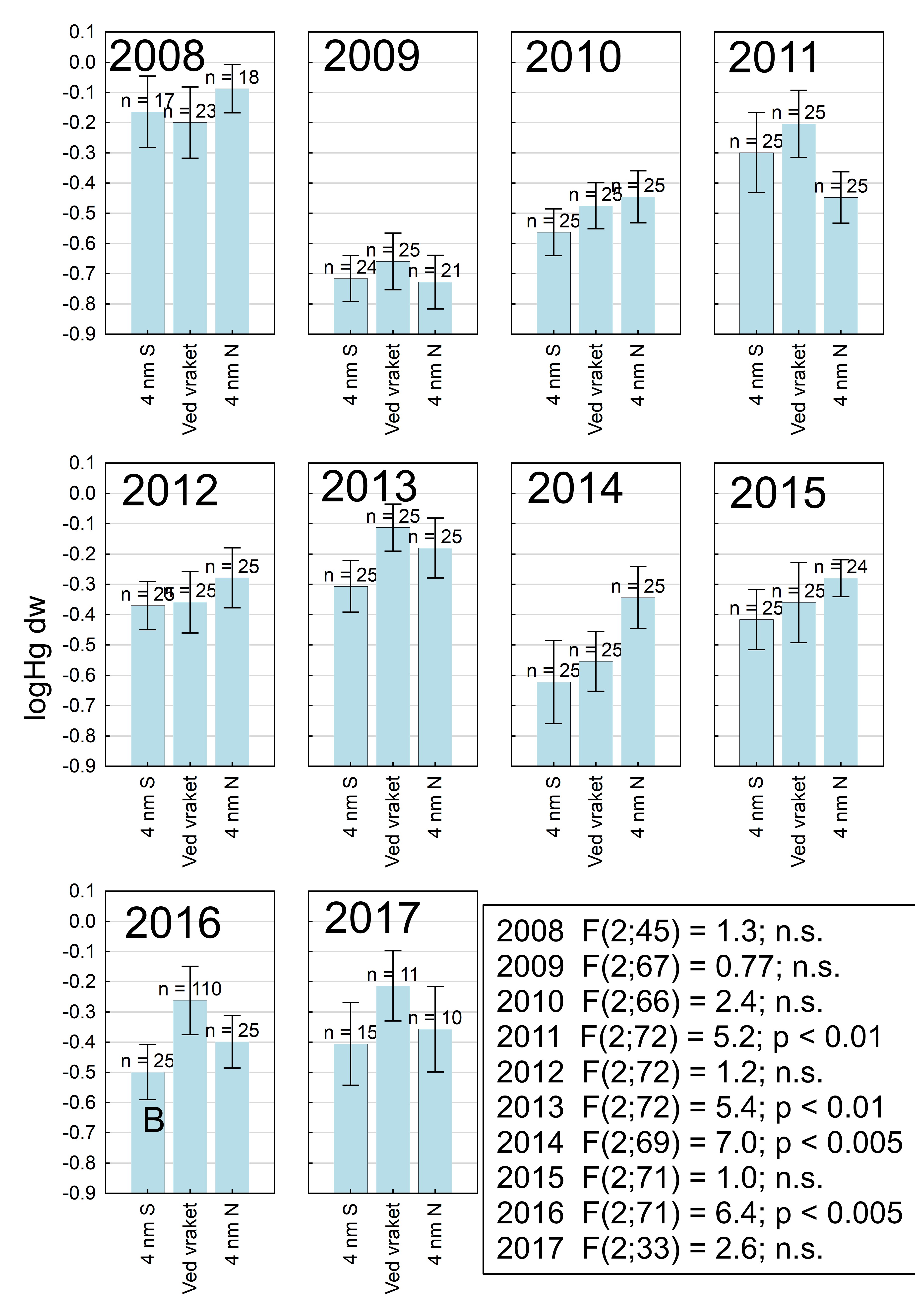 Figur A1. Sammenligning for hvert år 2008-2017 av de tre lokalitetene ved vraket, fire nautiske mil (nm) sør (S) og fire nm nord (N) med hensyn til kvikksølv i brunmat av krabbe. Tørrvekts-konsentrasjon av kvikksølv (logtransformerte verdier) er vist med gjennomsnitt ± 95 % konfidensintervaller. Resultat av enveis variansanalyse er vist for hvert år. A og B på søylene markerer hvilke av gruppene som er signifikant ulike (p<0.05).