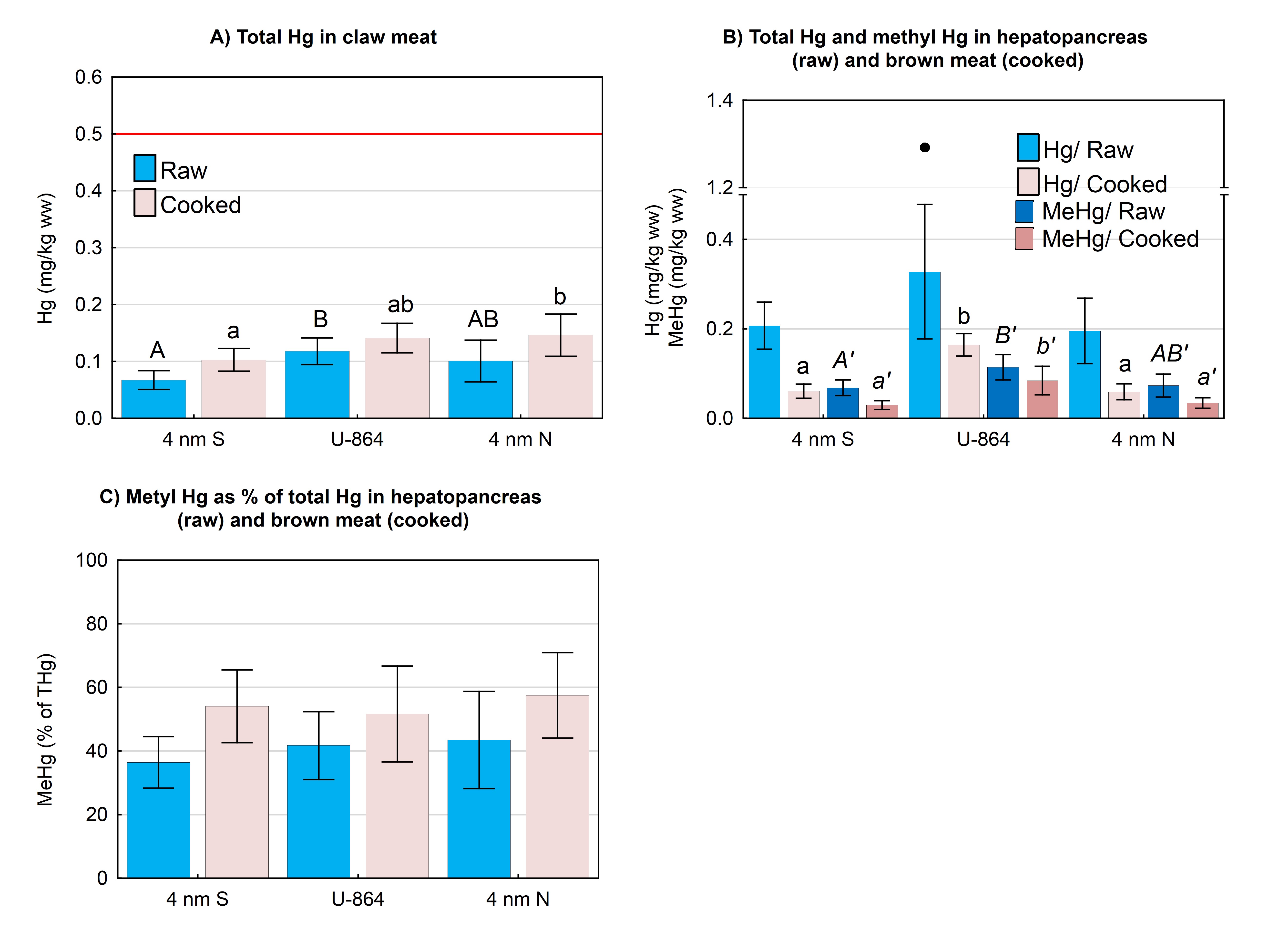 Kvikksølvkonsentrasjonen i klokjøtt av kokte krabber varierte fra 0,029 til 0,22 mg/kg våtvekt, med et totalt gjennomsnitt på 0,13 mg/kg våtvekt (Tabell 3; Tabell A5). Krabbene som ble behandlet uten koking hadde gjennomsnittlig kvikksølvkonsentrasjon i klokjøtt på 0,094 mg/kg våtvekt, med et spenn fra 0,002 til 0,22 mg/kg våtvekt. Ingen krabbe prøvetatt i området nær vraket av U-864 i 2017 hadde konsentrasjoner av kvikksølv i klokjøtt høyere enn EUs og Norges grenseverdi på 0,5 mg/kg våtvekt som for krabbe bare gjelder klokjøtt.