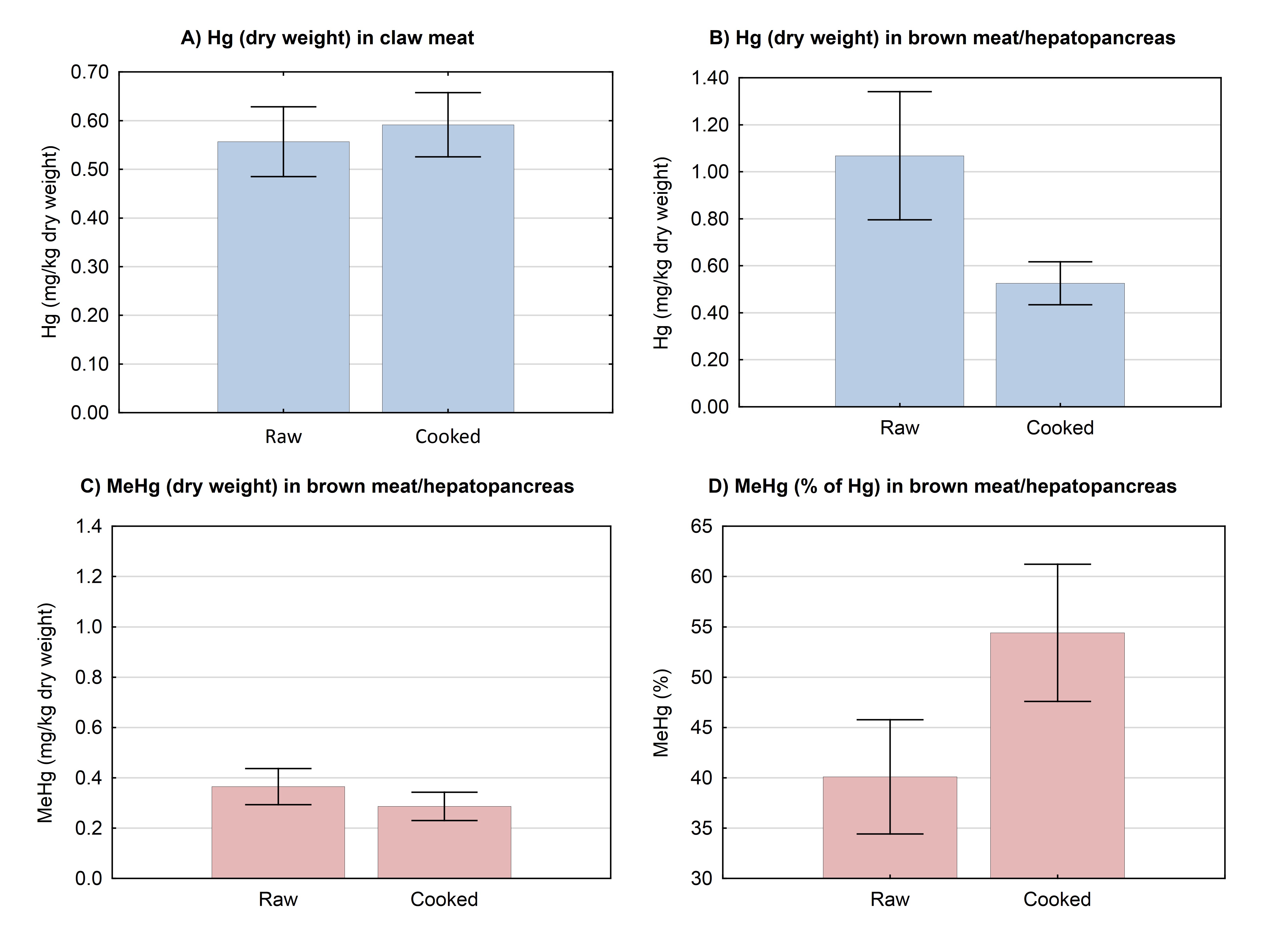 Brunmat og hepatopankreas ble også analysert for metylkvikksølv ved GC-ICPMS med isotopfortynning (Valdersnes m.fl., 2012). Innveid prøve ble tilsatt spikeløsning og tetrametyl ammonium hydroksid (TMAH) og satt på rotator for dekomponering. Løsningen ble pH-justert, tilsatt derivatiseringsreagens, og derivatiserte kvikksølvforbindelser ble ekstrahert over i heksan. Prøvene ble til slutt analysert på GC-ICPMS og kvantifisert ved isotopfortynning. Metylkvikksølvkonsentrasjon er oppgitt som konsentrasjon kvikksølv og som andel metylkvikksølv-kvikksølv av totalkvikksølv.