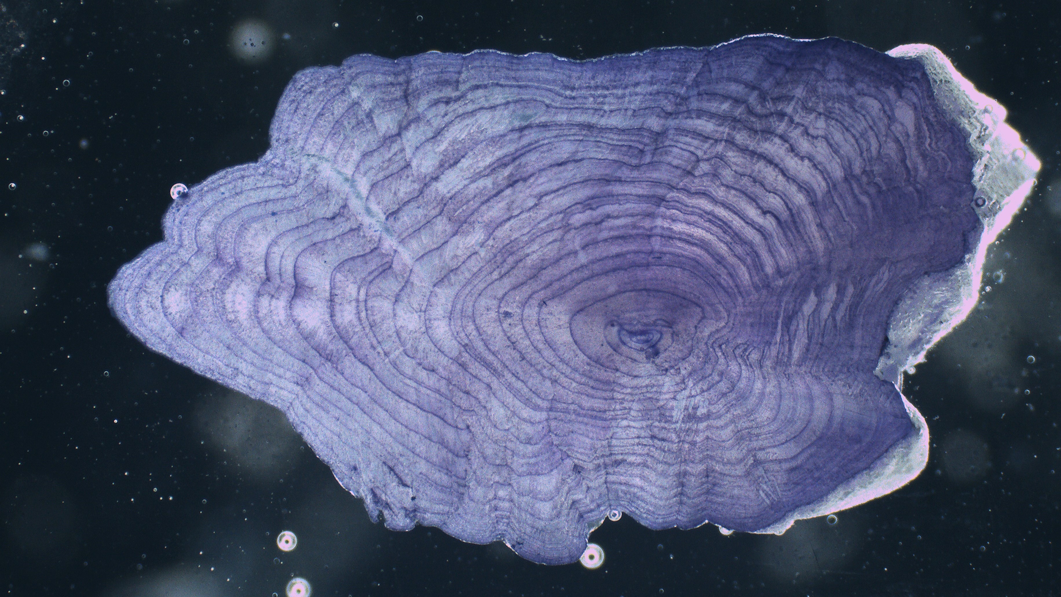 Tverrsnittet av øyresteinen, viser at ålen er 18 år gammal frå glasålstadiet. Ålen blei fiska i Flødevigen. (Foto: Caroline Durif)