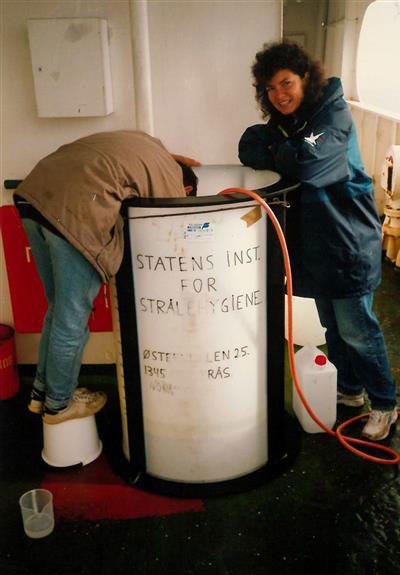 På tokt til vraket i 1993 ble det tatt vannprøver for å sjekke innhold av det radioaktive stoffet plutonium. Foto: Statens strålevern