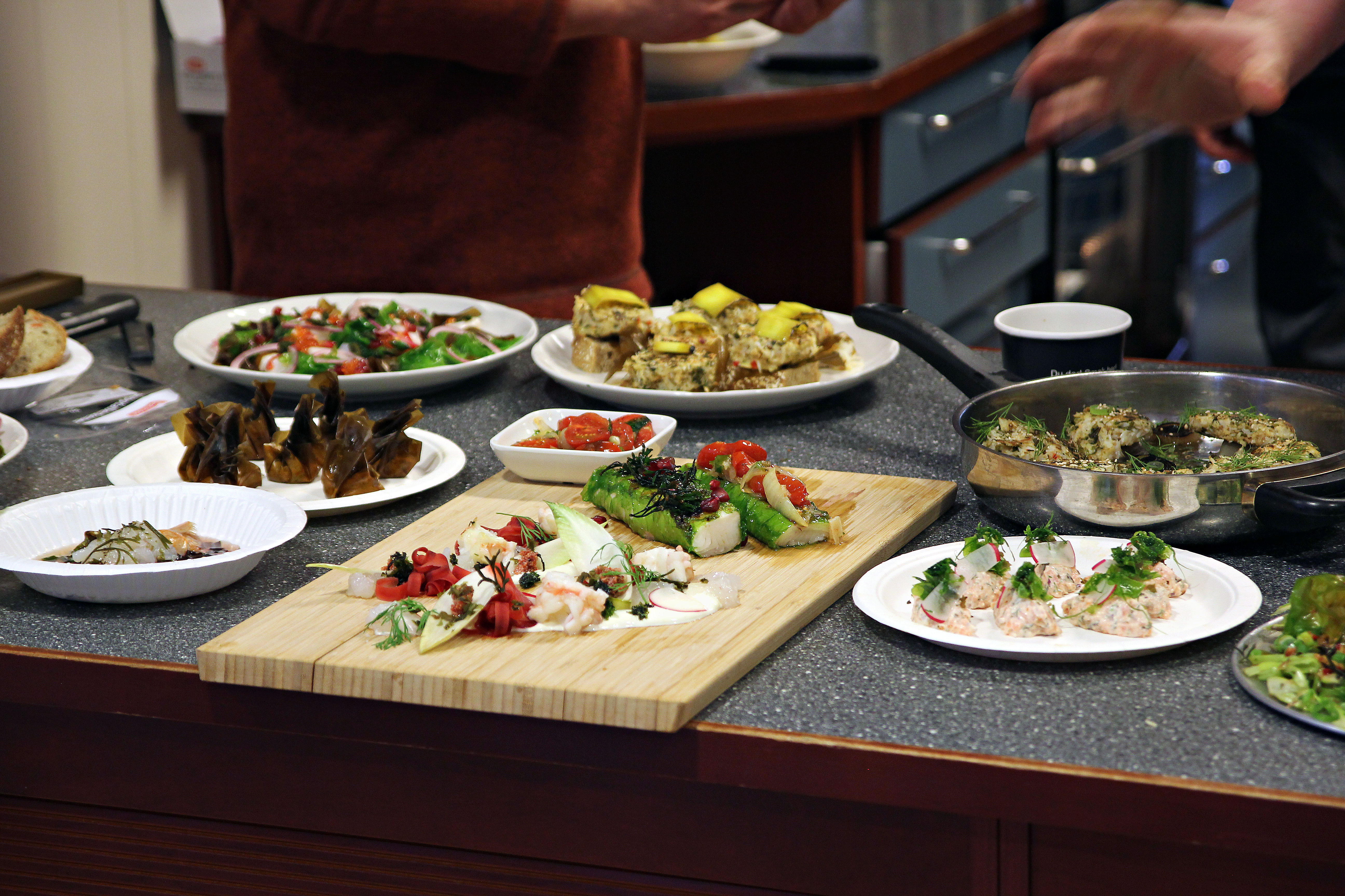 Sukkersaltet kveitetataki rullet i havsalat med grillet sauetang, sukkertare og tomatconcasse, røkt ørretmousse pakket inn i sukkertare og ceviche av kamskjell med havsalat, sukkertare, blæretangknopper, rødløk, granateple og butare var bare noen av rettene kokkene disket opp med. (Foto: Anders Jakobsen)