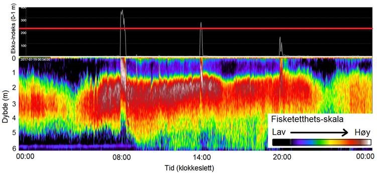 På ekkoloddet kan man se når fiskene beveger seg høyere opp i vannet, der fôringen foregår.