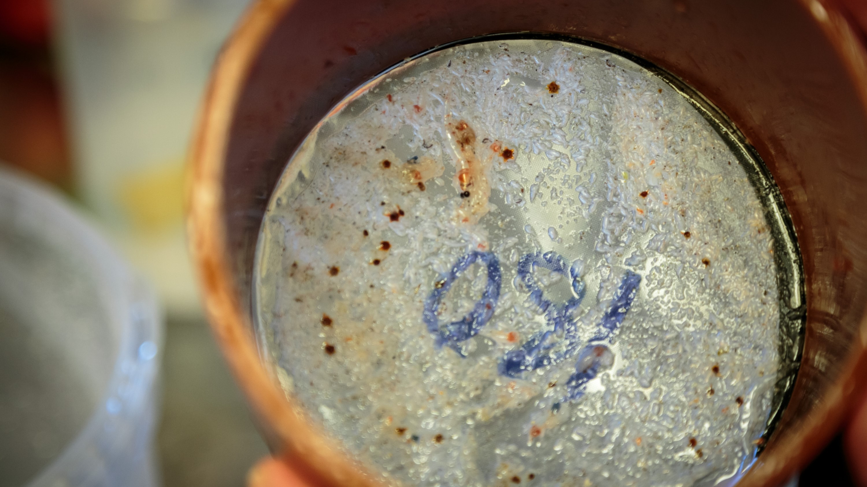 På toktet er det vanskeleg å sjå kva trålfangsten inneheld. Eit par kril, lauv og organisk rusk, ein bit malingsflass, sjøstjernelarvar og små, gjennomsiktige dyr. Den synlege fangsten er for det meste plankton. Mikroplasten kan ligge innimellom.