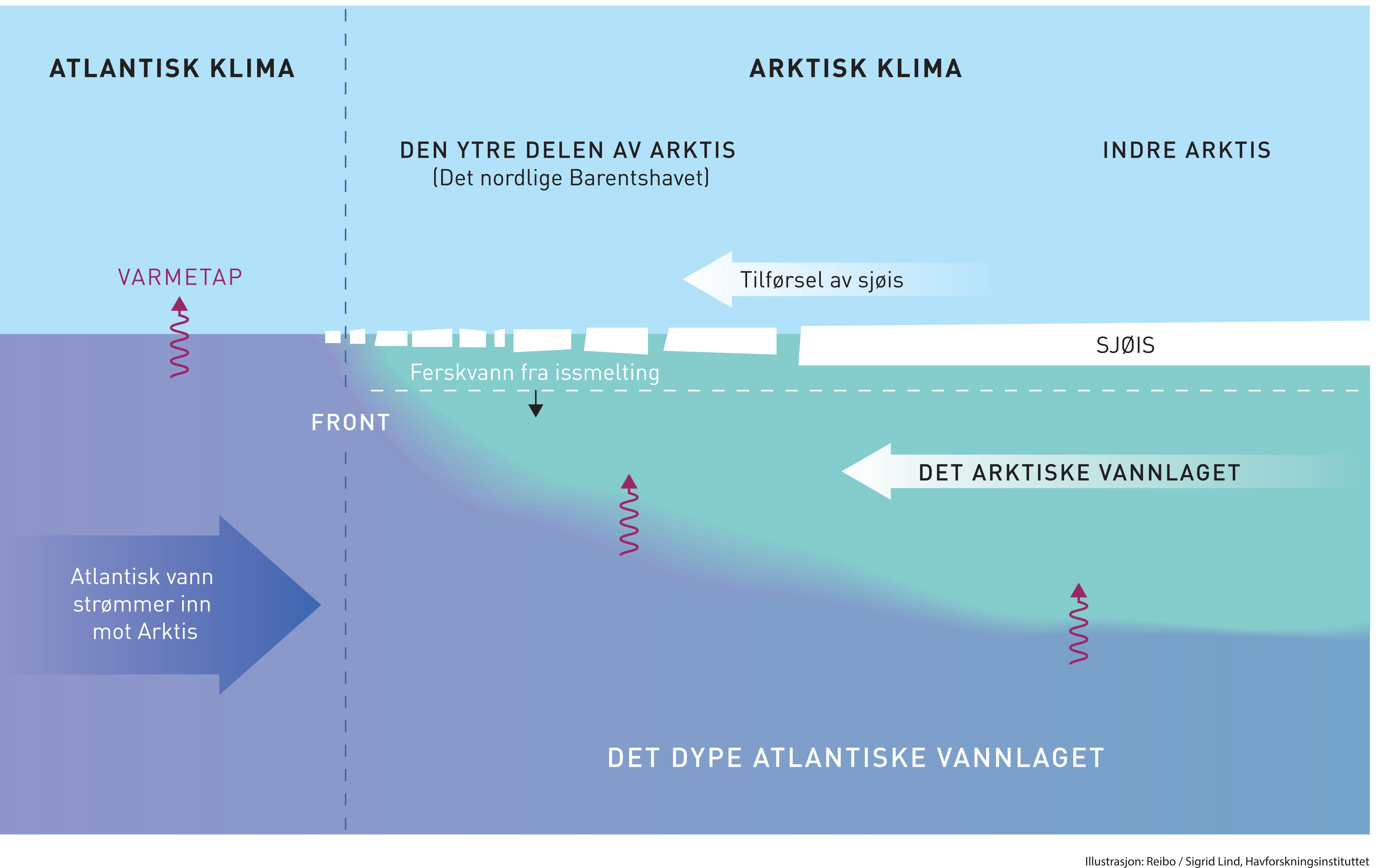 Det nordlige Barentshavet er den ytre delen av Arktis som grenser mot varme atlantiske havområder. Her kjempes en tøff kamp mot varmt og salt atlantisk vann i dypet. Uten tilførsel av sjøis fra det indre Arktis vil lagdelinga bryte sammen. (Figur: Ola Reibo / Sigrid Lind)