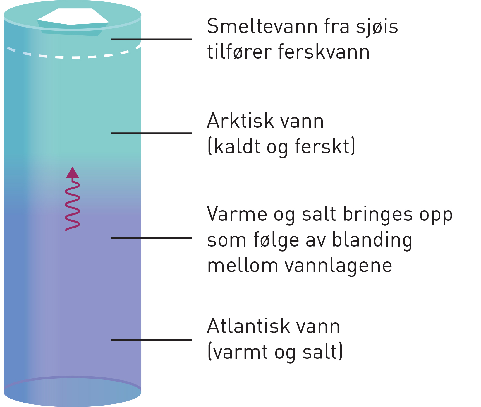 Det nordlige Barentshavet er kaldt, lagdelt og isdekt. Lagdelinga, med kaldt arktisk vann over varmt atlantisk vann, gjør at sjøis kan dannes og dekke overflata. Blanding mellom vannlagene gjør det arktiske vannet varmere og saltere. Det må tilføres ferskvann for å opprettholde lagdelinga. (Figur: Ola Reibo / Sigrid Lind)