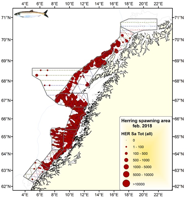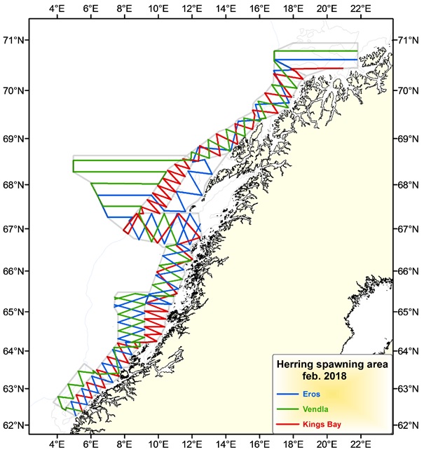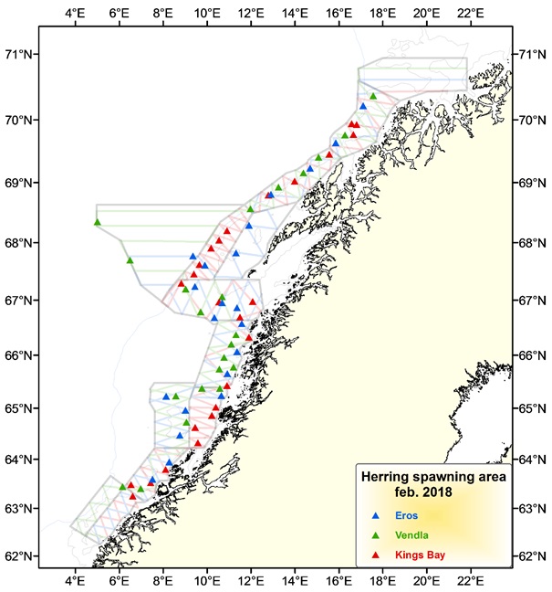 I løpet av perioden 13. til 25. februar ble gytefeltene fra Møre (62ºN) til grensen mellom Troms –Finnmark og Tromsøflaket (71ºN) dekket akustisk med de innleide fiskebåtene «Eros», «Kings Bay» og «Vendla». Toktet ble gjennomført under svært gode værforhold, uten avbrudd, og med sikksakk-design fremfor et design med parallelle transekter som i 2017 (figur 1) på årets tokt medførte det nye designet en høyere dekningsgrad i de ulike områdene.