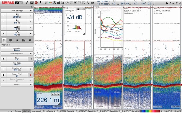 Figur 4. Eksempel på typiske akustiske registreringer (ekkogram) på Kings Bay ved bruk av Simrad EK80 ekkolodd med flere frekvenser (18, 38, 70, 120 og 200 kHz).