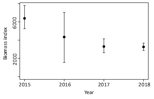Figur 5. Biomasseindeks (med 90 % konfidensintervall) estimert på gytetoktene 2015- 2018.