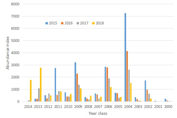 Til tross for en stabil total biomasseindeks, ble det estimert nedgang i biomassen av 6 år gammel og eldre sild, men dette ble kompensert med en økning av 5 år gammel og yngre sild. Den mest tallrike årsklassen på årets tokt var 2013-årsklassen som bidro med 23 % i antall sammenlignet med 10 % i 2017. Dette er en endring fra de tidligere årene i serien der 2004-årsklassen har vært mest tallrik (figur 6). Et tegn på at toktet egner seg bra i bestandsvurdering som grunnlag for råd, er at man faktisk kan følge nedgangen i årsklassene fra år til år (Figur 6), en nedgang som er ventet, siden fisk dør på grunn av fiske og andre (såkalt naturlige) årsaker.