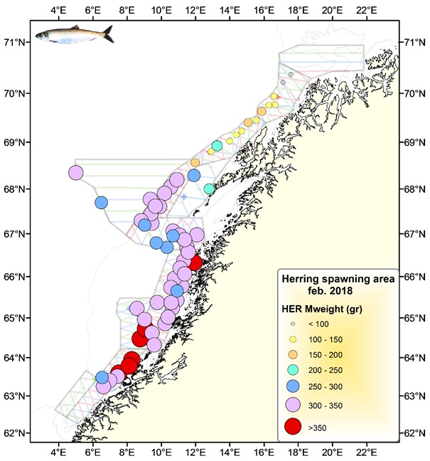 Som i 2017 og i tidligere år ble de nye rekruttene i form av 2014- og 2013-årsklassen i hovedsak registrert i de nordlige områdene langs Vesterålen og Troms, noe som også fremkommer av gjennomsnittsvekten i trålhalene langs kysten (figur 7). Dette viser seg å være en typisk adferd ved at førstegangsgyterne tenderer til å gyte nærme overvintringsområdet, som for disse årsklassene har vist seg å være i havet utenfor Troms og i fjordene rundt Kvænangen. Disse rekruttene var også litt tregere i modningen, og gytte nok noe seinere enn den eldre delen av bestanden.