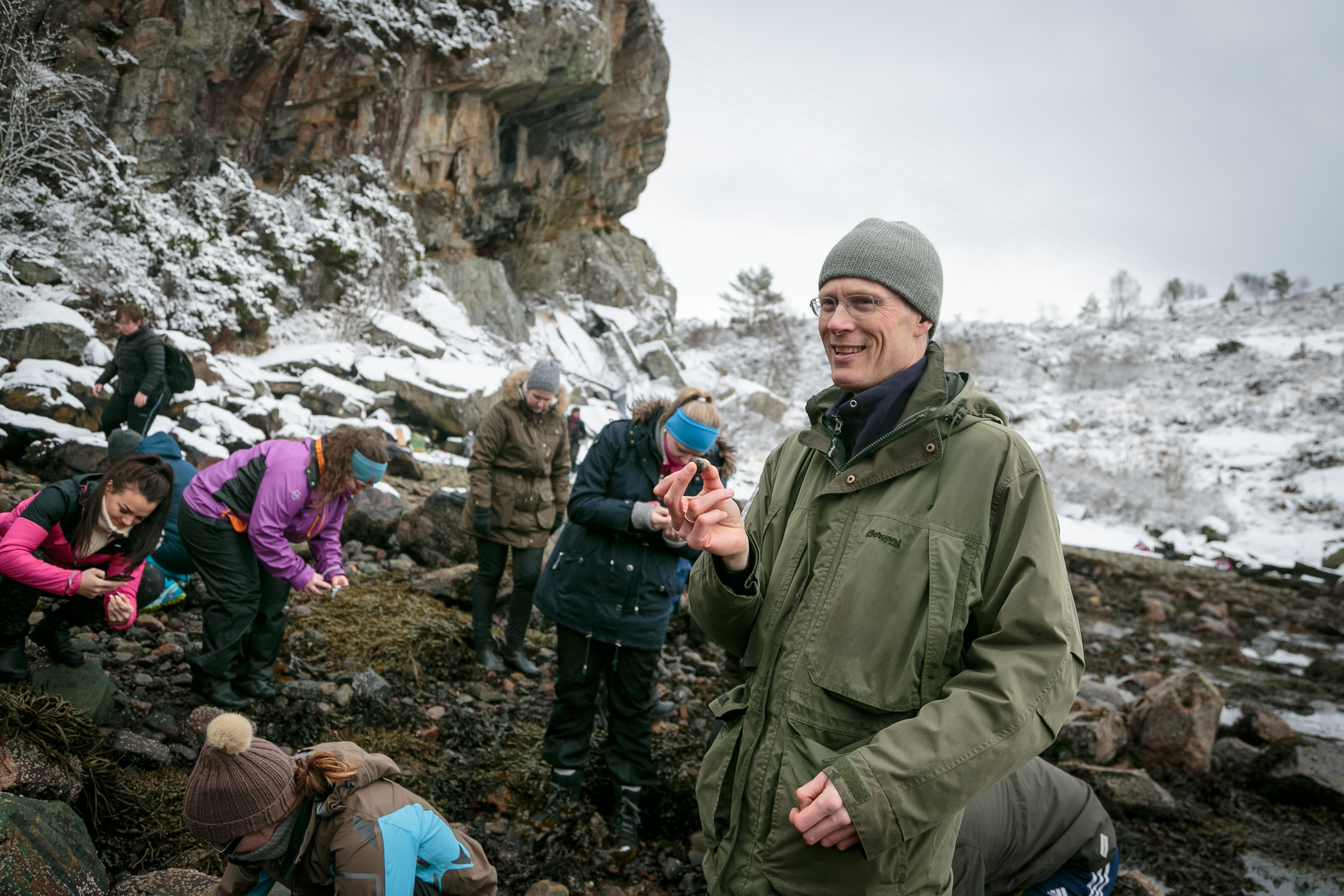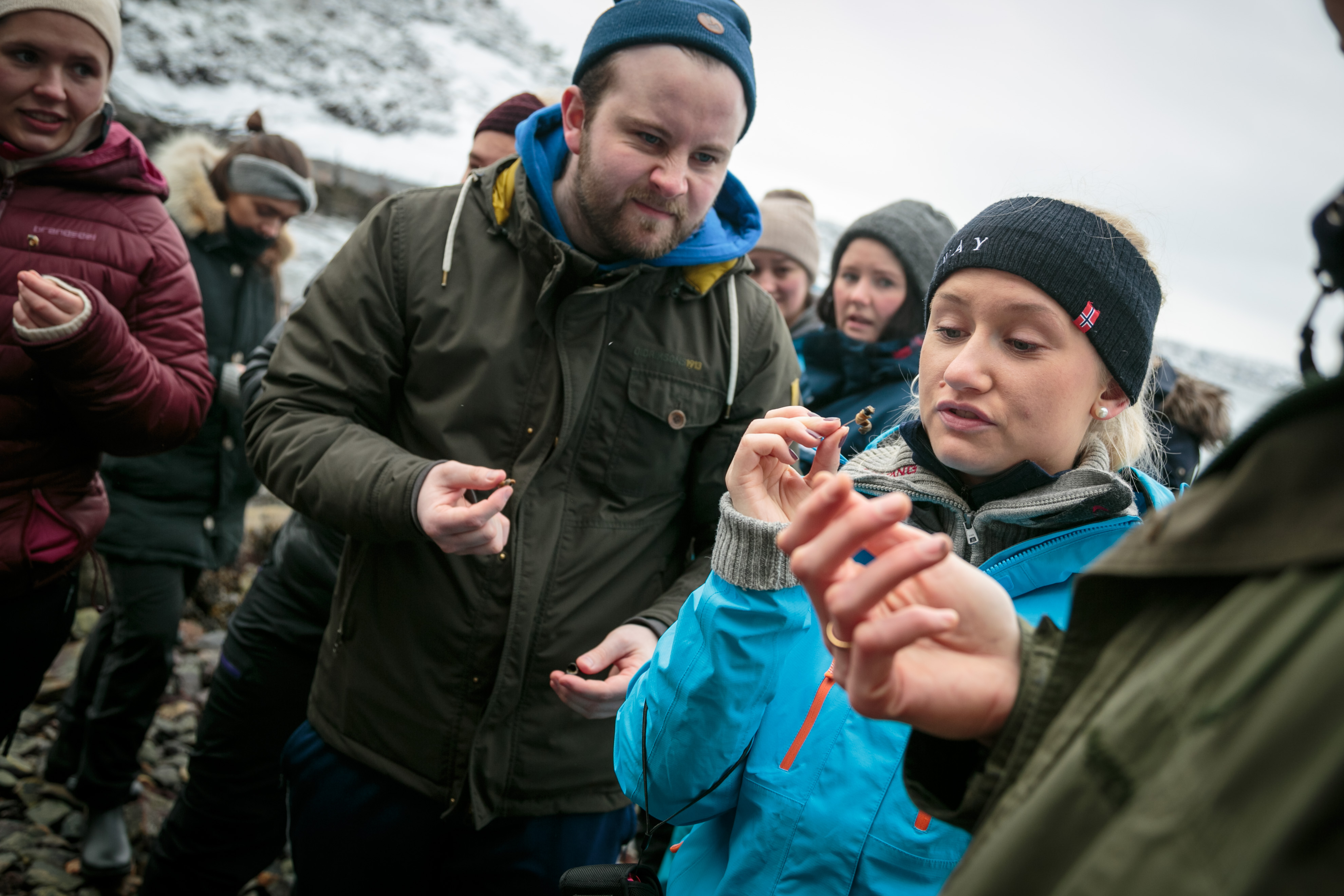 Sit du ein time i fjøra og plukkar i deg det du finn, så blir du mett, hevdar Arne Duinker. Lærarstudentane lyftar på steinane i fjøra og leitar etter alt som er etandes.