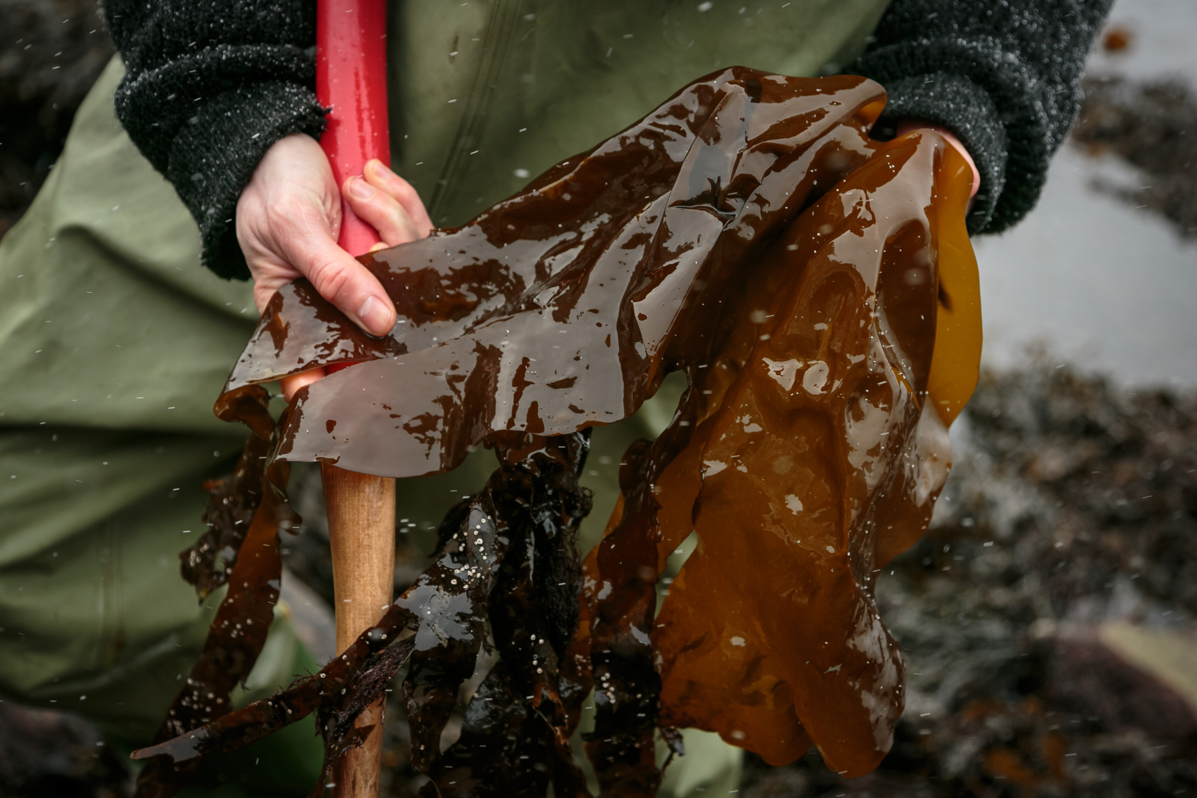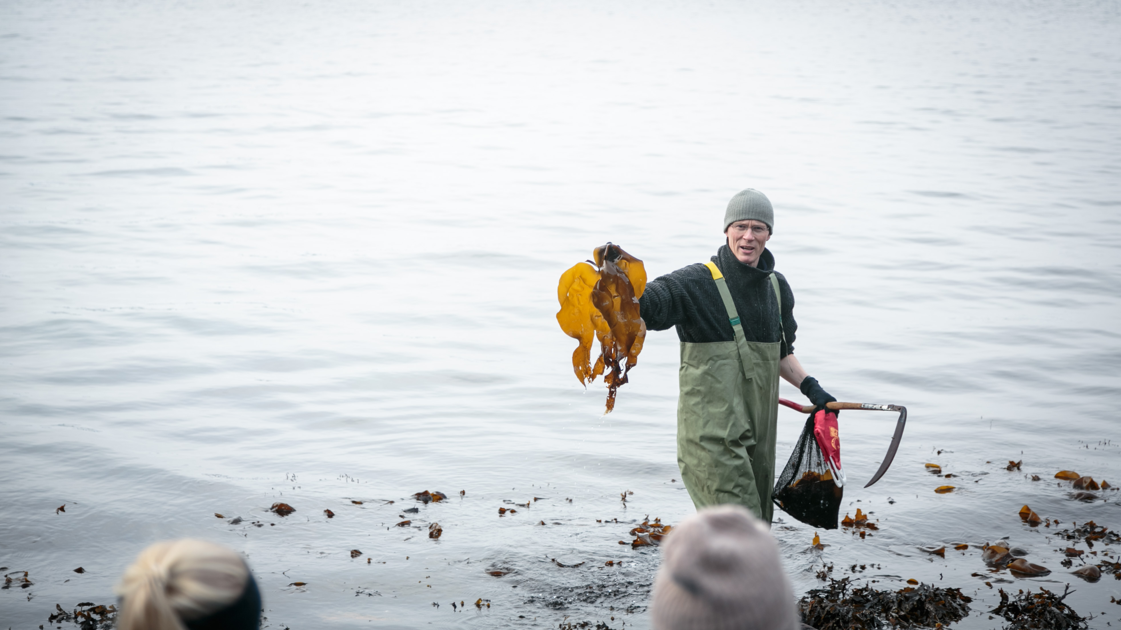 Arne Duinker har oftare vadebukse enn badebukse på seg. Med ljåen i den eine handa og sankeposen i den andre haustar han dei saftigaste tareblada. Både stortaren og fingertaren er fin å steike på bålet.