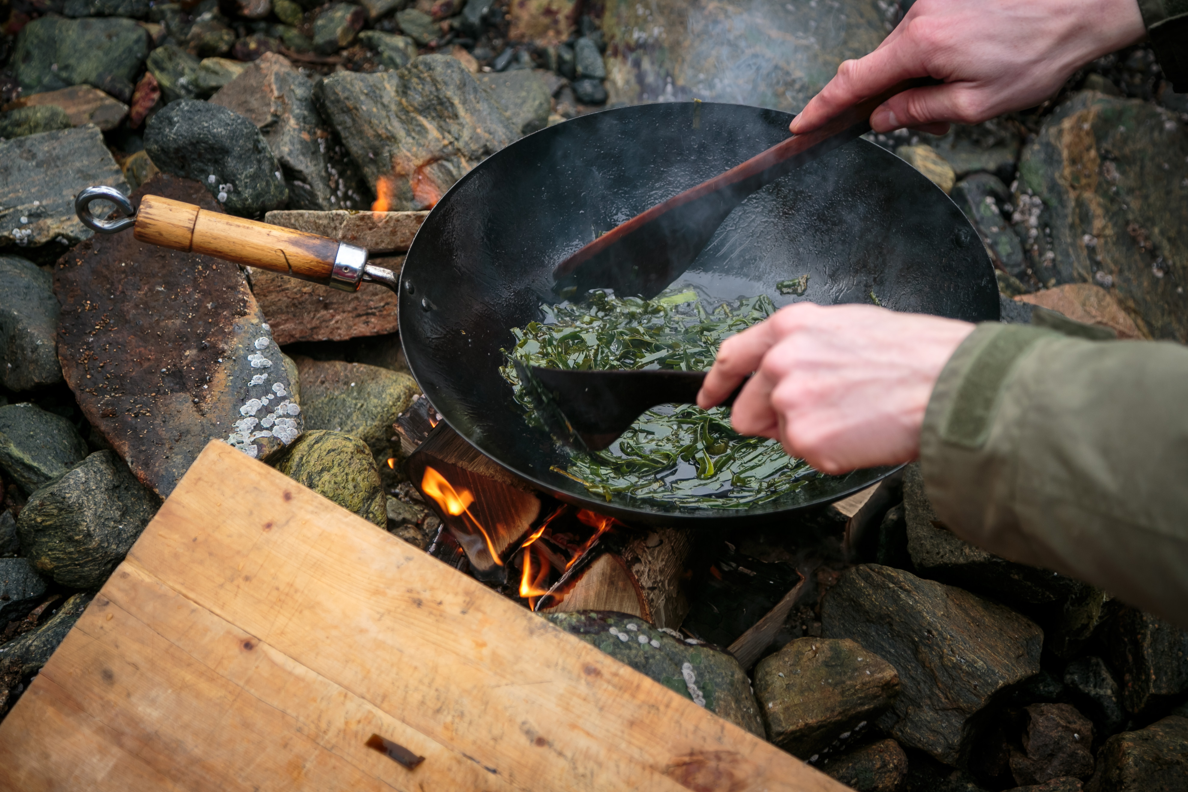 Dei brune tarestrimlane steikast i olje til taren plutseleg blir grøn. Etter ei stund høyrer du lyden av stålull i panna, og taren har blitt overraskande salt og sprø.