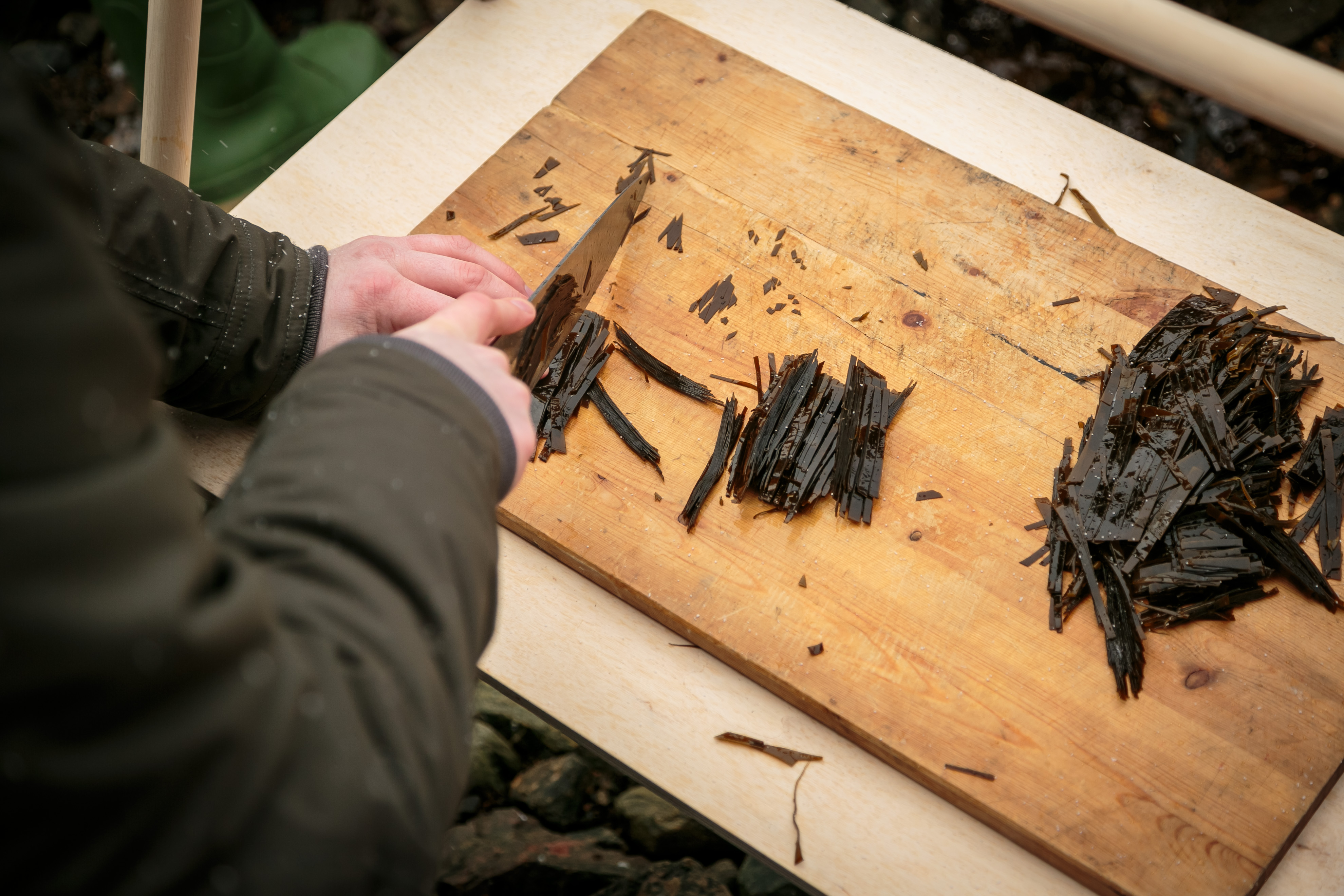 Studentane blir sette til å lage tarechips. Taren kuttast i Julienne-strimlar på 1-2 millimeter. Er han breiare enn dette blir det vanskeleg å få han sprø.