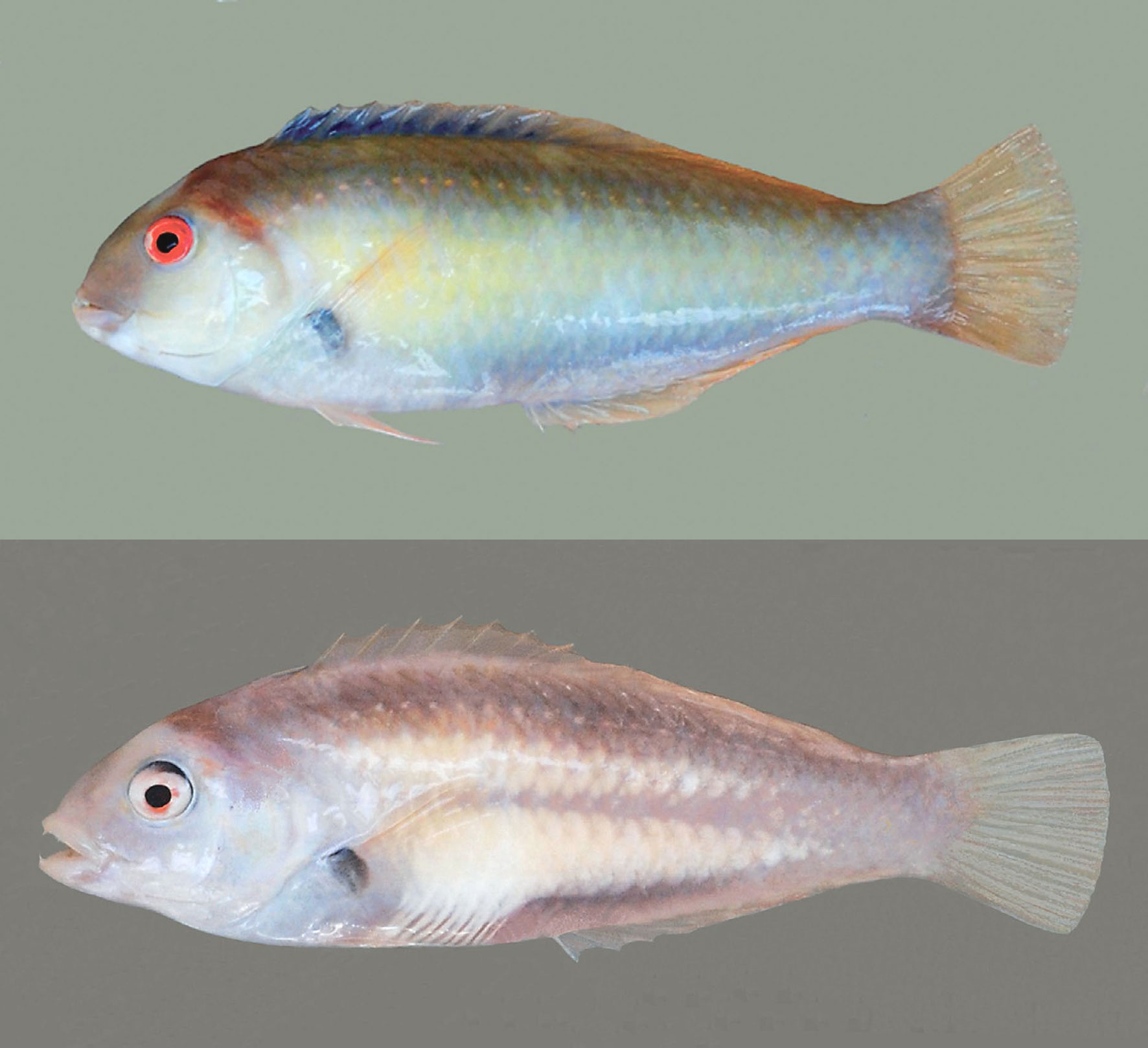 Oddgeir Alvheim sin første «nye» fiskeart fikk navnet Novaculops alvheimi i 2013. Disse to leppefiskene ble oppdaget i Det indiske hav den samme dagen i 2008. Den øverste er en hannfisk, mens den nederste er en hunnfisk. (Foto: Oddgeir Alvheim / Havforskningsinstituttet)