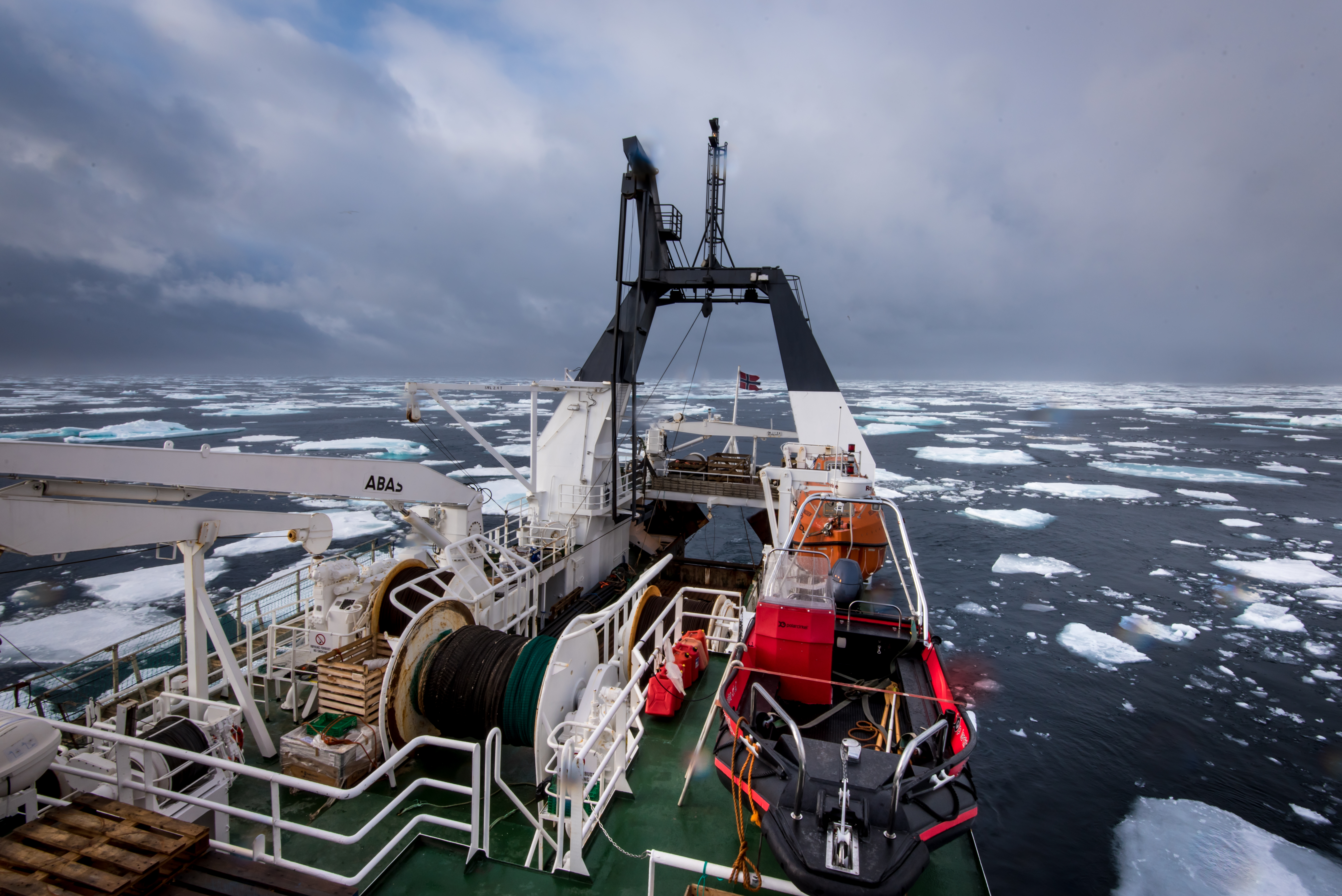 Forskningsfartøyet «Helmer Hanssen» på tokt i Polhavet. Varmt hav gir mindre sjøis nord for Svalbard, noe som kan føre til endret havmiljø. Derfor har Norge økt forskningsinnsatsen i dette området. (Foto: Elvar H. Hallfredsson)