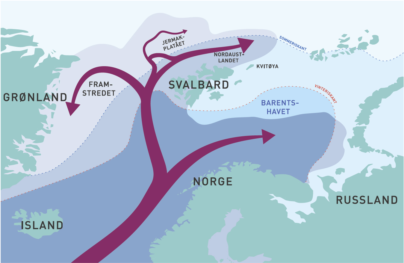 Varmt vann som strømmer nordover fra Atlanterhavet deler seg opp i flere greiner. En stor del følger bunntopografien nord for Svalbard mot øst og fortsetter inn i Polhavet. Kart: Reibo, Sundfjord, Renner / Framsenteret