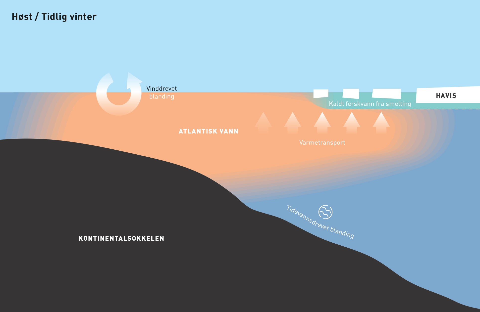 En ny studie som er publisert i Journal of Geophysical Research viser at den største innstrømningen til Polhavet finner sted om høsten og tidlig på vinteren, og at vannet også er varmest på denne tiden av året. (Studien er en del av Framsenterets forskningsflaggskip om Polhavet.) Kraftige pulser med vann varmere enn fem grader kommer inn i området akkurat på den tiden av året da havisen skal fryse til.