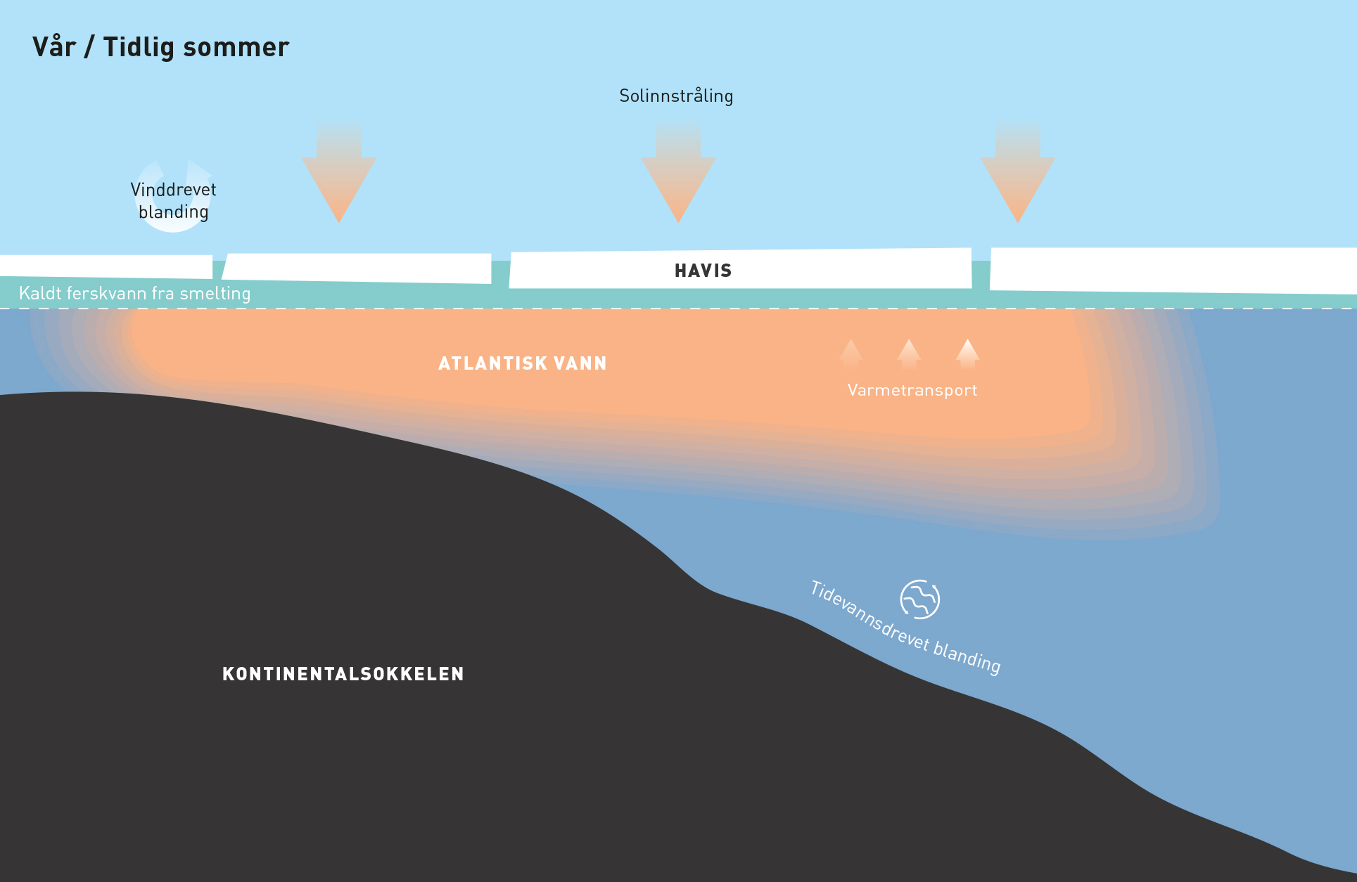 På seinvinteren avtar innstrømningen og overflatevannet blir kaldere. Vanligvis dannes det et tett isdekke som kan gå helt inn til nordkysten av Svalbard. (Illustrasjon: Reibo, Sundfjord, Renner / Framsenteret)