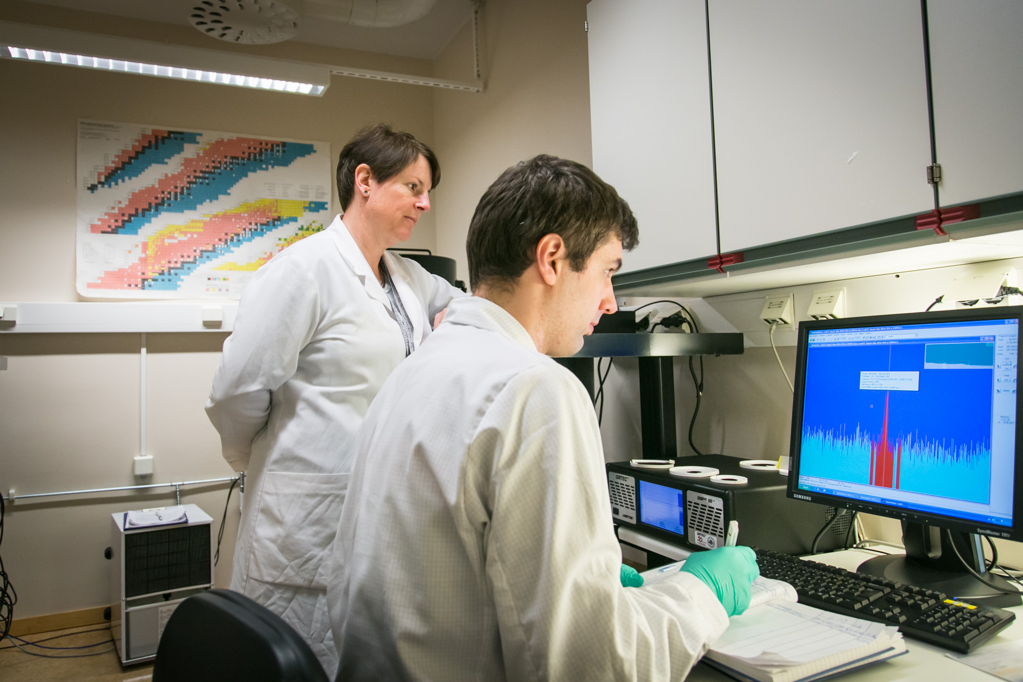 Hilde Elise Heldal veier sedimentlagene fra kjerneprøven. Hvert lag representerer noen år med sedimentering - men også forurensning. Foto: Erlend A. Lorentzen/HI