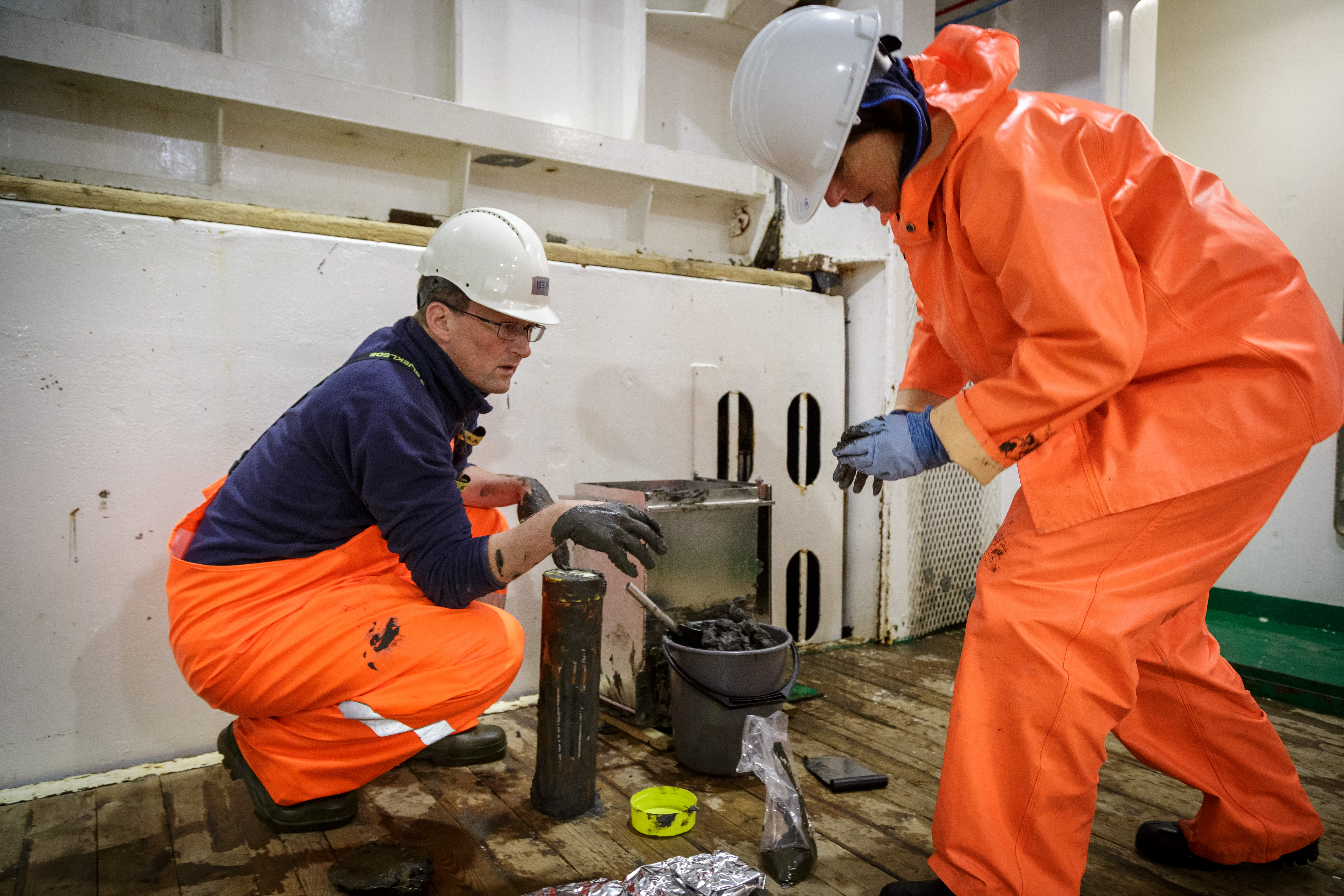 Slik ser sedimentprøver fra havbunnen ut, når de blir spadd ut på dekk. Her er Anders Fuglevik på økosystemtoktet i Barentshavet i fjor. Foto: Erlend A. Lorentzen/HI