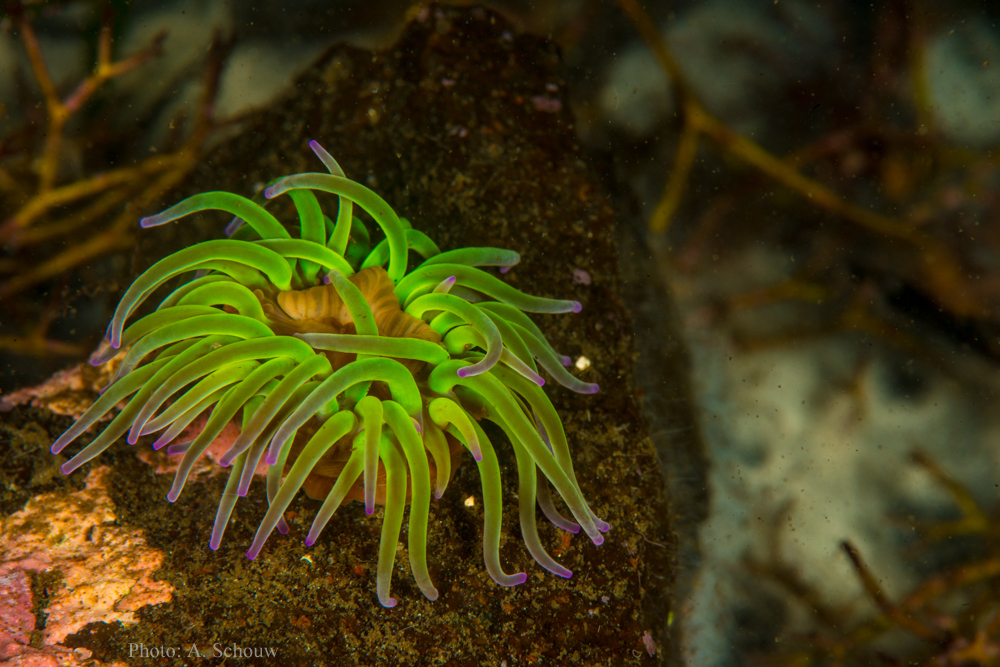 – Dei seier det liknar på “snakelocks anemone” (Anemonia viridis) som dei finn på heilt grunt vatn. Arten har vore rekna som sjeldan i Noreg og har difor ikkje noko norsk namn. No betyr “viridis” fargen “grøn”, og arten er mest kjend som ein grøn anemone med lilla tentakeltuppar, seier Gro van der Meeren.