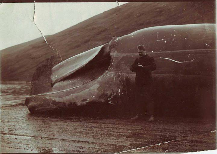 «Michael Sars» skulle brukes hvalundersøkelser, det var Stortingets betingelse for bevilgningen. Johan Hjort reiste til Finnmark i januar 1901. Her fører han loggbok foran en nordkaper (Eubalaena glacialis). Bildet er trolig tatt på hvalstasjonen i Mehamn, seinvinteren eller tidlig på våren i 1901. Opphavsrett: Privat, Nils Lid Hjort.
