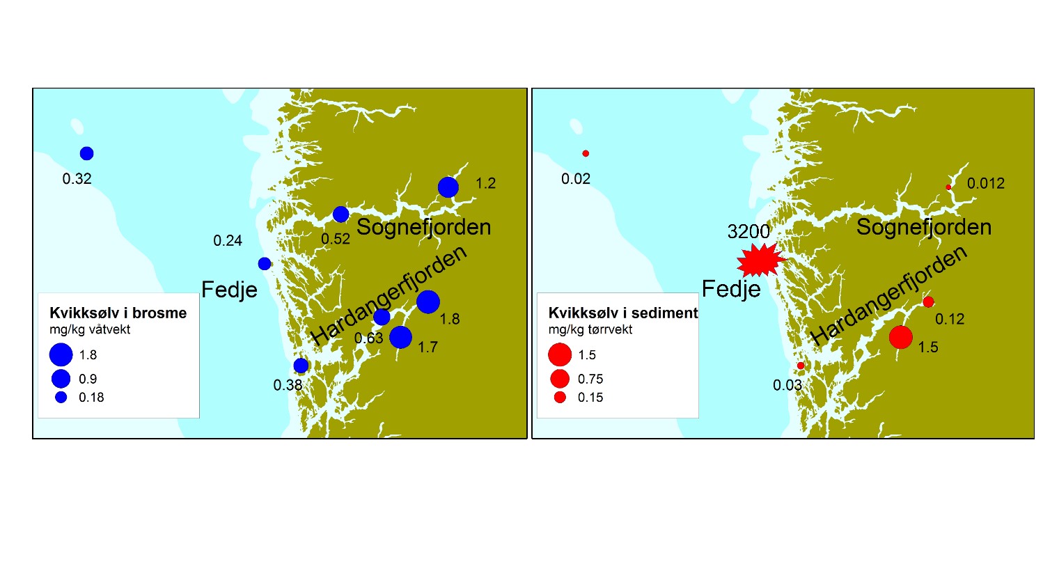 De blå prikkene på kartet viser hvor det er funnet mest kvikksølv i brosme på vestlandet. De røde prikkene viser hvor det er funnet mest kvikksølv i sedimentene på havbunnen og fjordbunnen. Kartene viser at det ikke alltid er en sammenheng mellom mengden kvikksølv i sediment og i fisk.