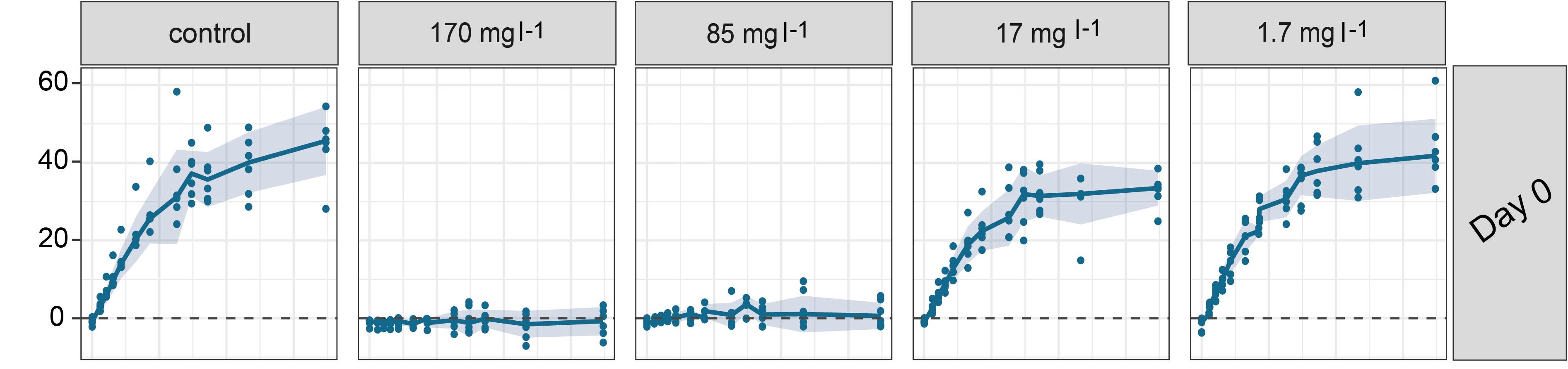 Som plantar på land, produserer tare oksygen i sollys. Grafane viser oksygenproduksjonen til fem grupper tare i aukande lysnivå. Målinga er gjort rett etter eksponering av fire ulike konsentrasjonar lusemiddel og ei ueksponert gruppe til samanlikning (kontroll):