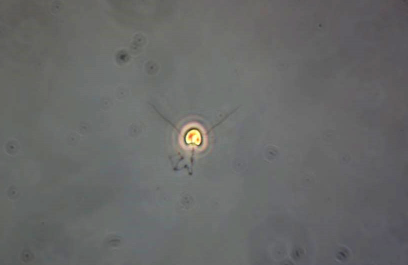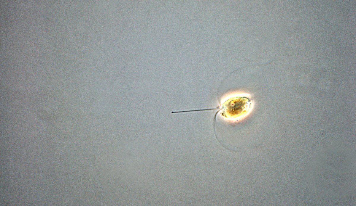 Algen som de siste dagene har ført til stor fiskedød i Nord-Norge er bokstavelig talt mikroskopisk. Selve algen er under 10 mikrometer lang - det vil si under 0,01 mm. Siden den er så liten viser ikke detaljene i et vanlig mikroskop. Derfor må den undersøkes i et elektronmikroskop for at forskerne skal kunne artsbestemme den helt sikkert - da får du et slikt bilde som viser øverst i saken. Bildet er tatt i forbindelse med endelig artsbestemmelse sist uke - og det levner ingen tvil om at det er Chrysochromulina leadbeateri som har drept oppdrettsfisk i Nord-Norge i det siste.