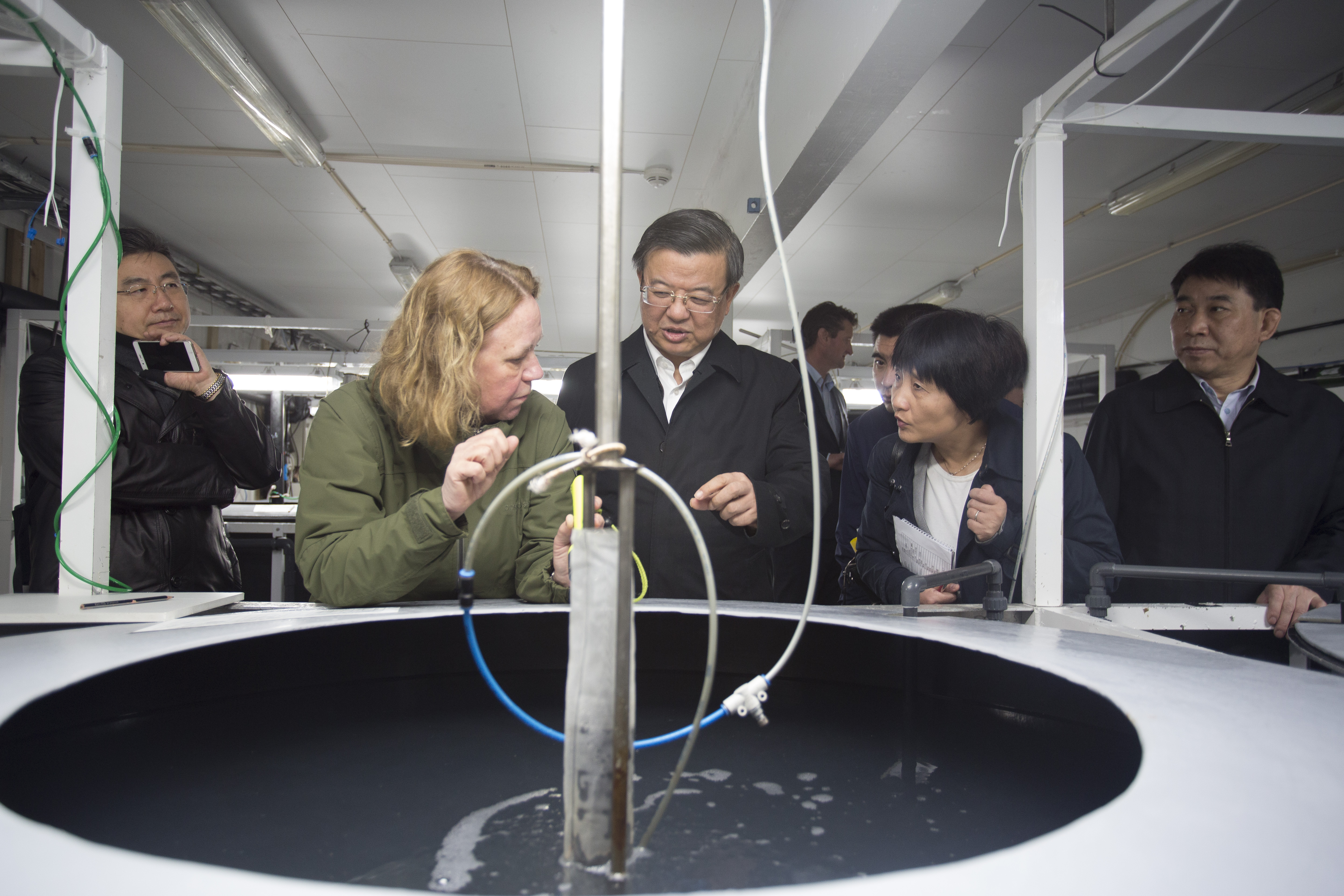 En veldig interessert kinesisk minister ville svært gjerne ha en oppdatering på hvordan det går med «dødsalgen». Han hadde flere spørsmål til forskningsdirektør Geir Lasse Taranger som tok imot følget og gav en orientering om instituttets arbeid med å overvåke vill- og oppdrettsfisk.