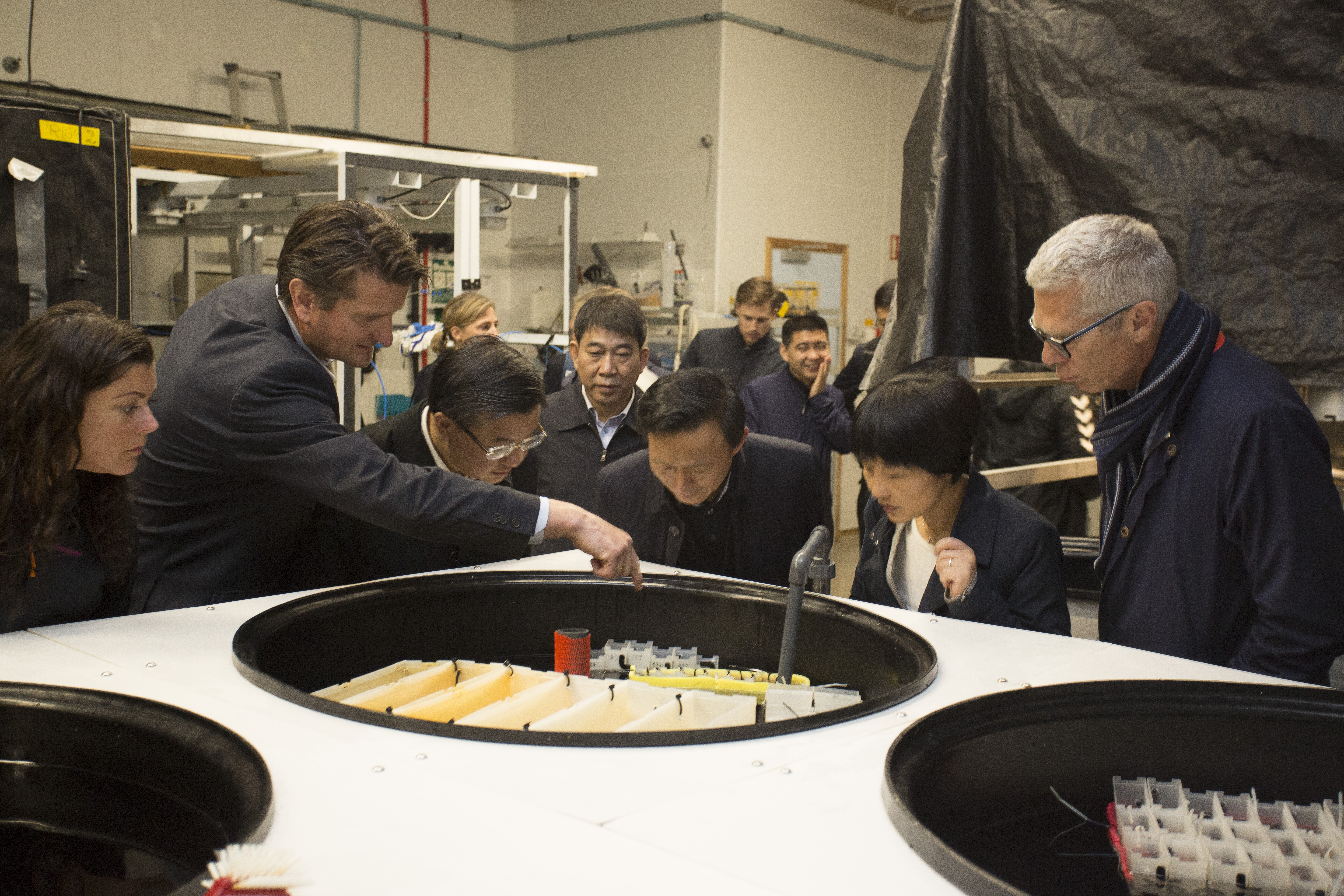 Forsker Birgitta Norberg gir den kinesiske ministeren Ni Yuefeng og følget hans en grundig innføring om kveitene som går i kar på forskningsstasjonen på Austevoll. (Foto: Kjartan Mæstad /HI)