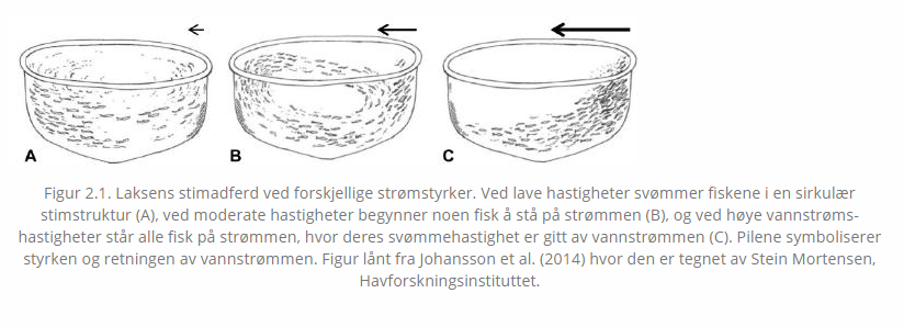 I merdene svømmer laksen normalt i en sirkelformet stim, hvor de selv velger svømmehastighet. Når vannstrømmen øker, blir denne gruppeadferden gradvis oppløst og fiskene stiller seg opp mot strømretningen, både ved siden av og bak hverandre. Økt vannstrøm leder altså først til at den frivillige svømmehastigheten overstiges og gruppens normale svømmestruktur endres.