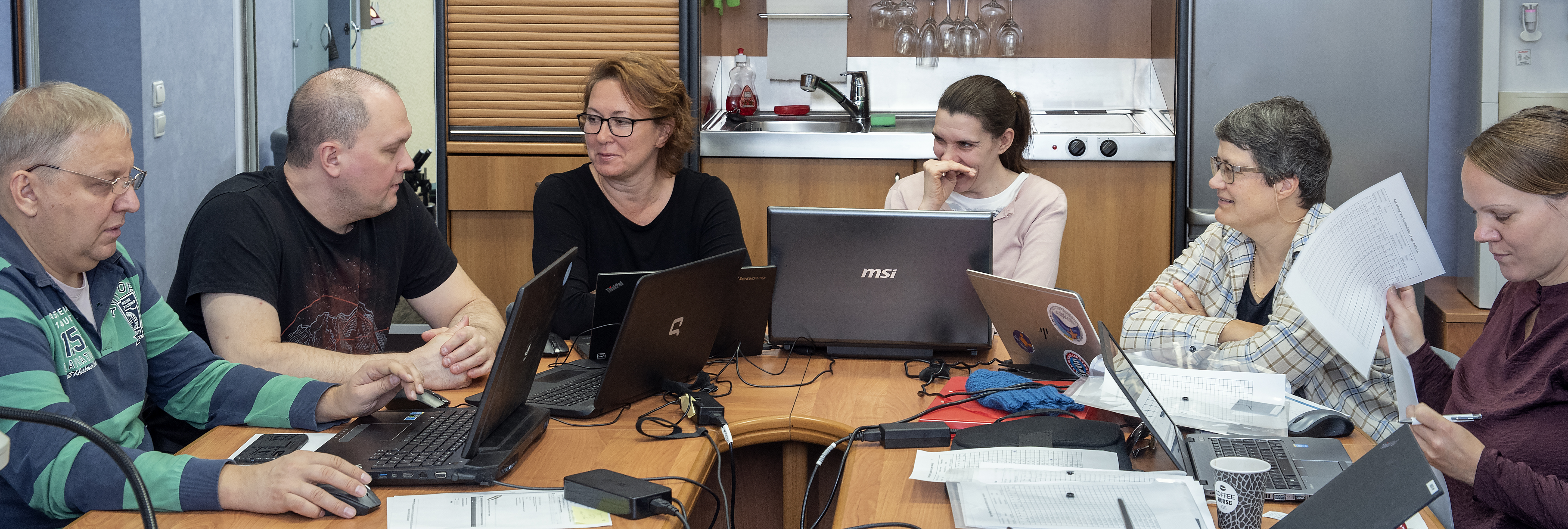 Norske og russiske havforskarar oppsummerer økosystemtoktet i Barentshavet. Frå venstre: Jurij Kovaljov, Dmitrij Prozorkevitsj, Elena Eriksen, Tatjana Prokhorova, Gro van der Meeren og Frøydis Tousgaard Rist Bogetveit. (Foto: Gunnar Sætra / Havforskingsinstituttet)