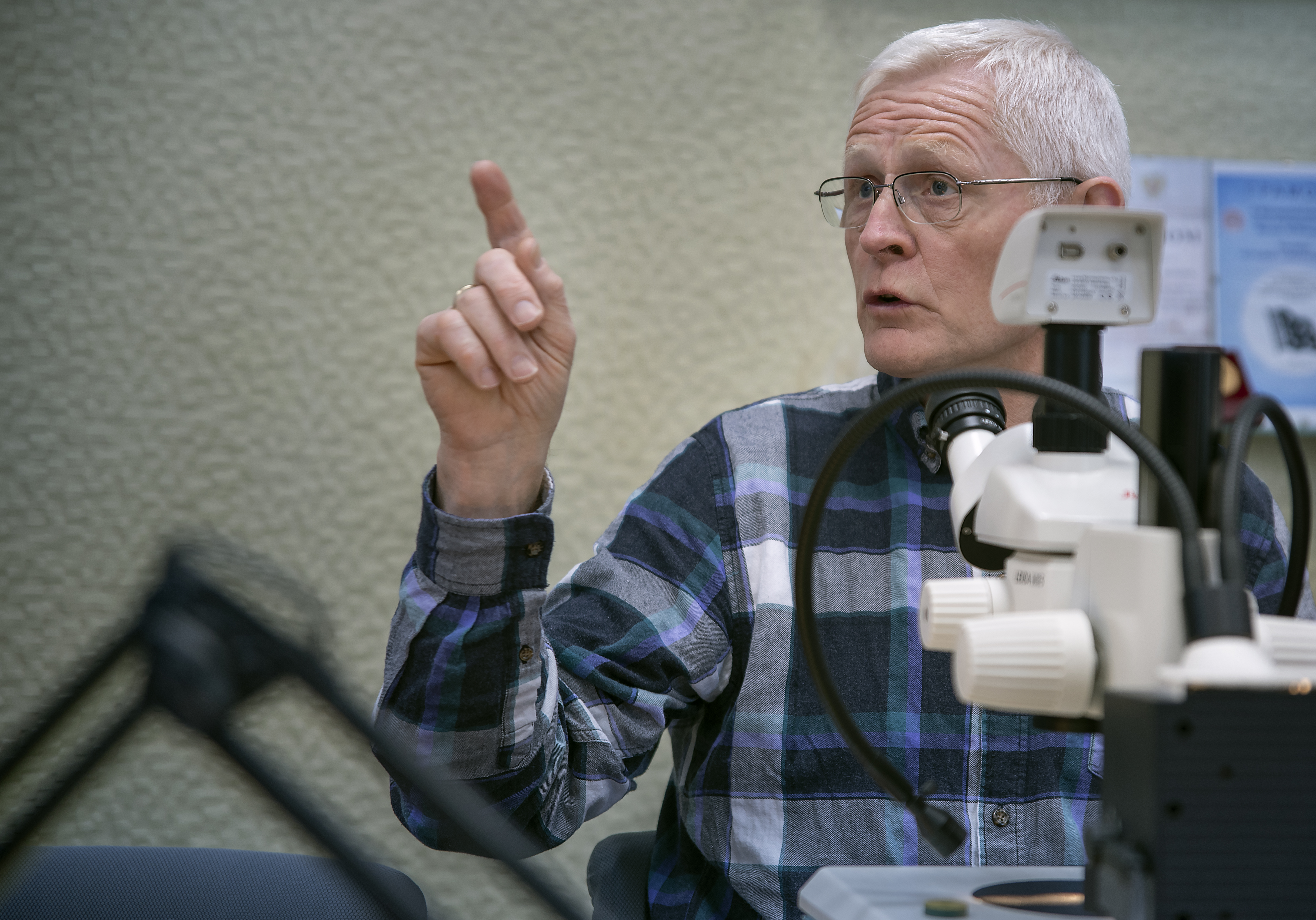 Diskusjonen ved skjermen held fram. Den går på norsk, engelsk og russisk. Tatjana Prokhorova snakkar alle tre språka og brukar dei etter behov. Ved bordet sjekkar dei andre alderslesarane eit par av øyresteinane ein gong til. Veteranen Røttingen set seg ved ei lupe og sjekkar ein av otolittane.