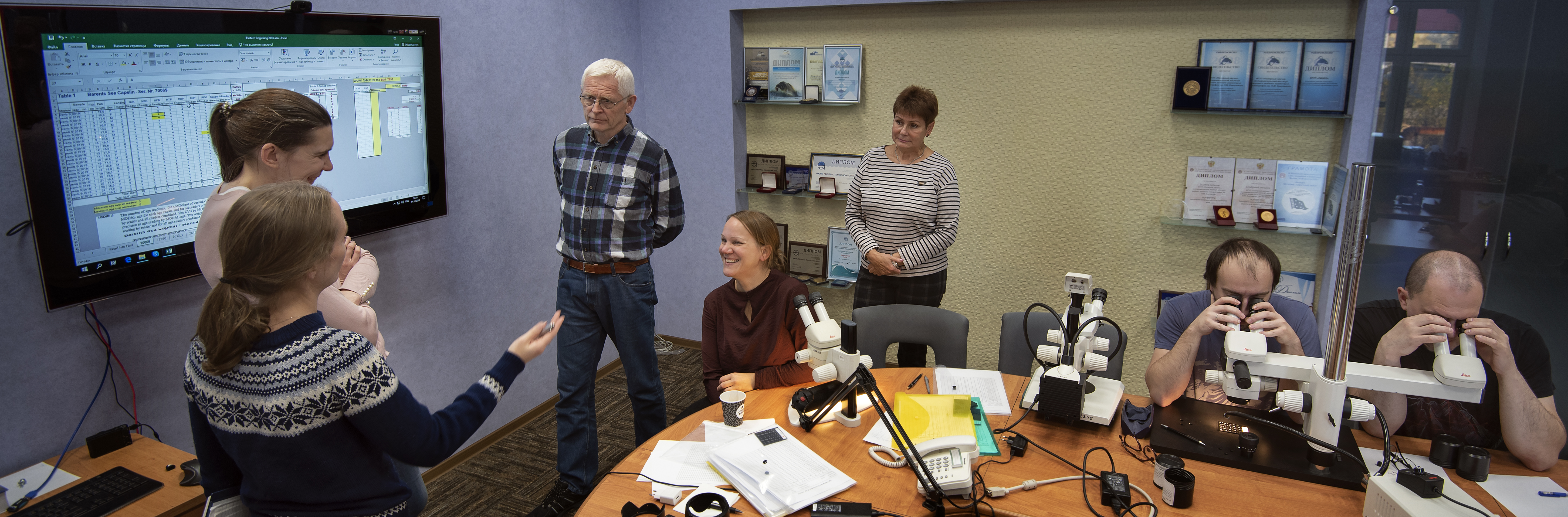 I eit av møteromma til Pinro, polaravdelinga til det fødrerale russiske havforskingsinstituttet (Vniro), er det samla ganske mange russiske og norske ekspertar. Så mange at ventilasjonsanlegget innimellom treng hjelp frå eit opent vindauge for at møtedeltakarane ikkje skal bli tungpusta. Eit par av dei sit ved kvar si lupe, andre kik på skjermane sine, skriv litt, ser på sidedama eller -mannen og vekslar eit og anna ord, peikar på skjermen og held fram med skrivinga. Innimellom bryt nokre ut i latter, andre tenker grundig og har alvorlege foldar i ansiktet.