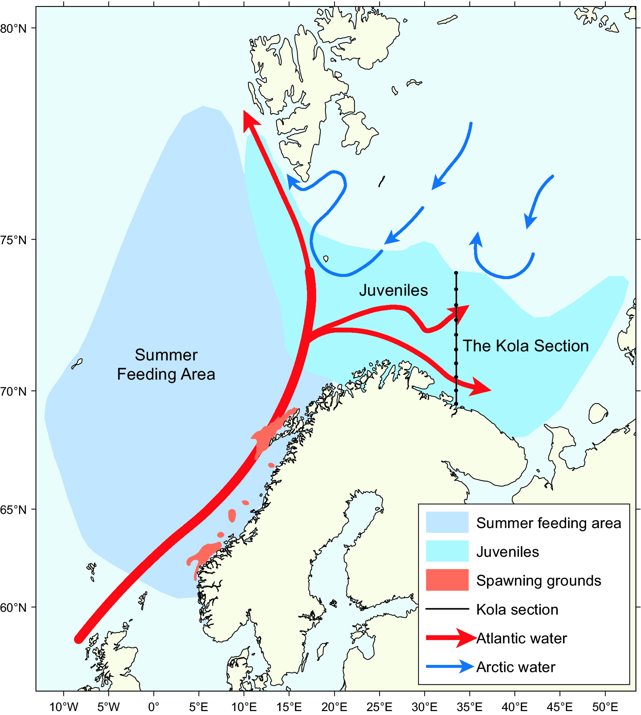 Beiteområder om sommeren (lyseblått), ungsild (turkis), gyteområder (rødt). Røde piler: atlantiske havstrømmer. Blåe piler: arktiske havstrømmer. Kolasnittet strekker seg fra Kolafjorden og til 75 grader nord. (Kart: Havforskningsinstituttet)