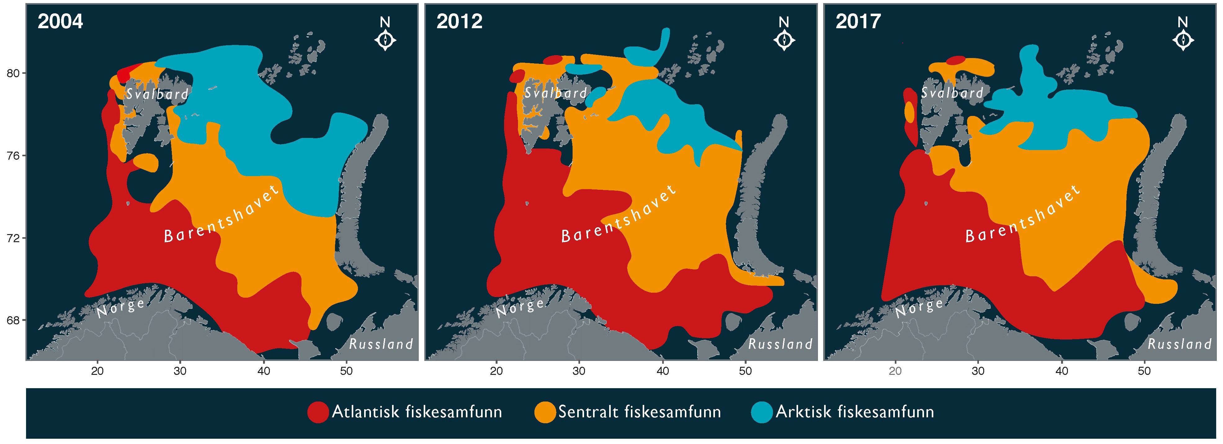Studien viser at det har funnet sted en markant endring i utbredelsen av fiskesamfunnene mellom 2004 og 2012. I denne perioden skjedde forflytningen i et raskere tempo enn det FNs klimapanel har forutsett i sine scenarioer.