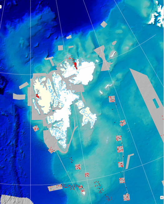 Dette kartet viser områdene som Mareano har kartlagt til nå ved Svalbard. De grå feltene er kartlagt med multistråleekkolodd. De røde og sorte prikkene viser stasjoner der biologi, geologi og kjemi er kartlagt. Du kan prøve å lage ditt eget kart i karttjenesten til Mareano.