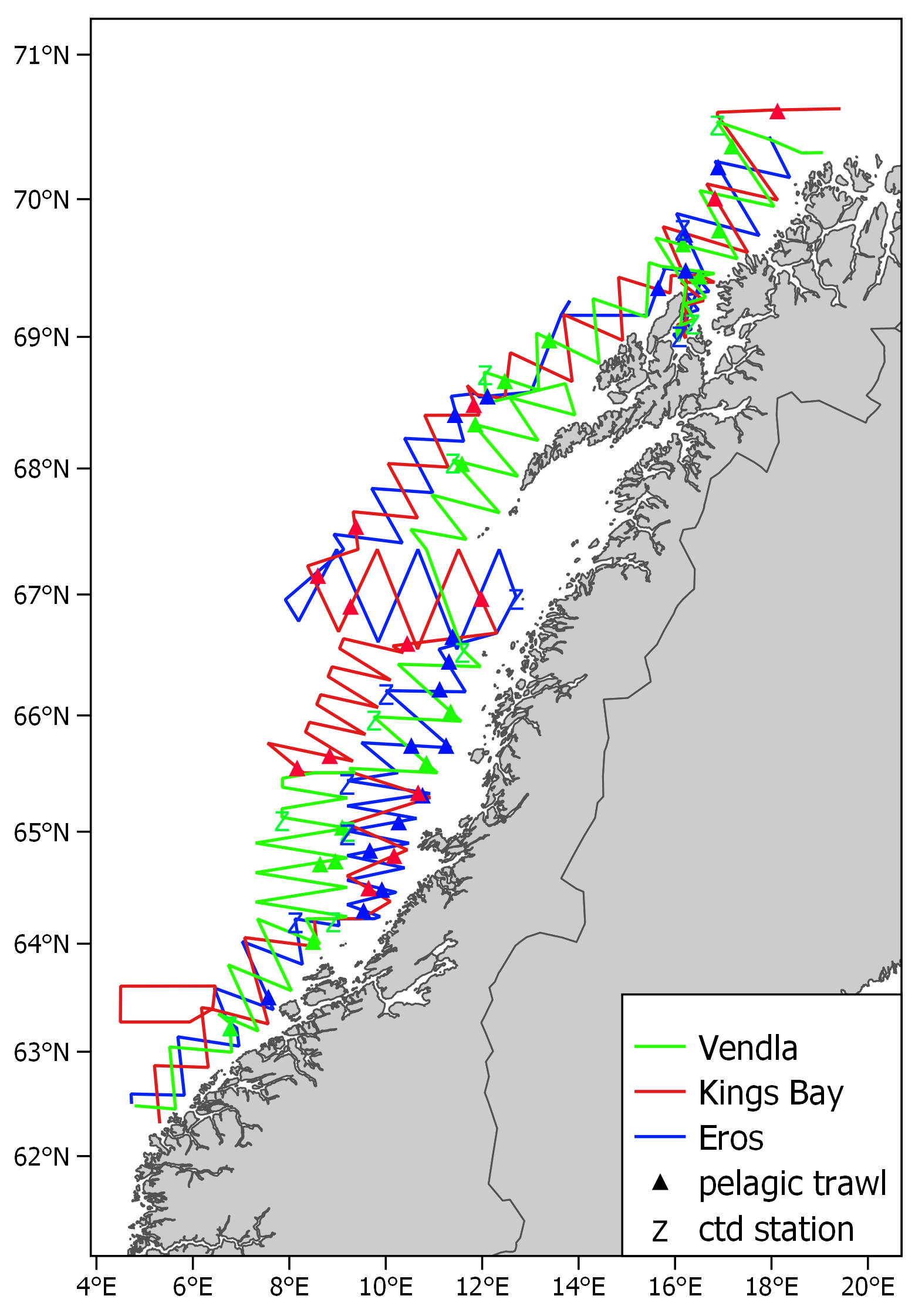 I løpet av perioden 14.-26. februar ble gytefeltene fra Møre til Nordvestbanken dekket akustisk med de innleide fiskebåtene «Eros», «Kings Bay» og «Vendla». Til tross for utfordrende værforhold ble toktet gjennomført som planlagt med god kvalitet på de akustiske og biologiske dataene.