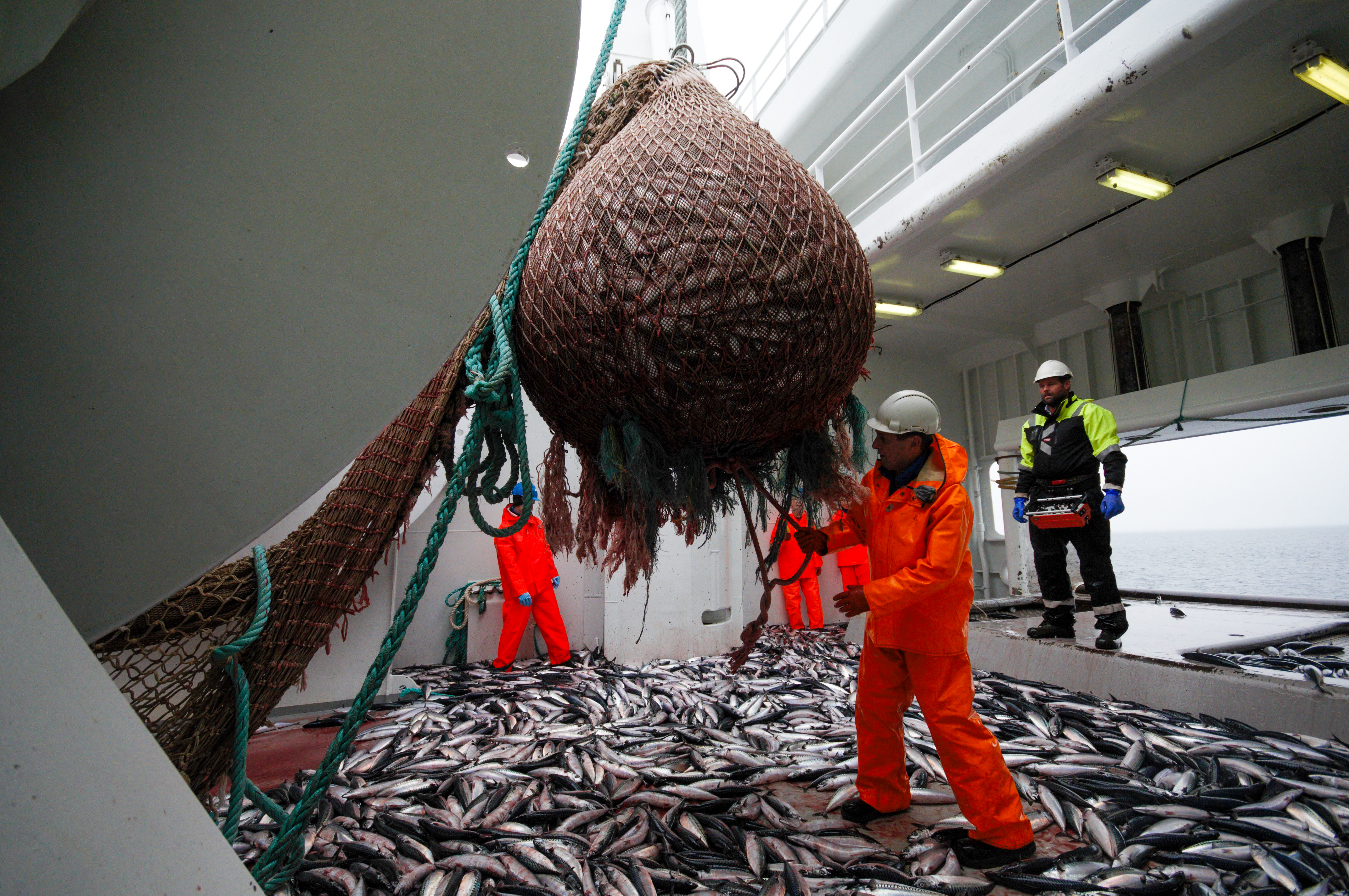 Stor makrell her på vei inn i den formålsdesignede Multpelt-trålen bak det norske fartøyet "Kings Bay", øst av Jan Mayen.
