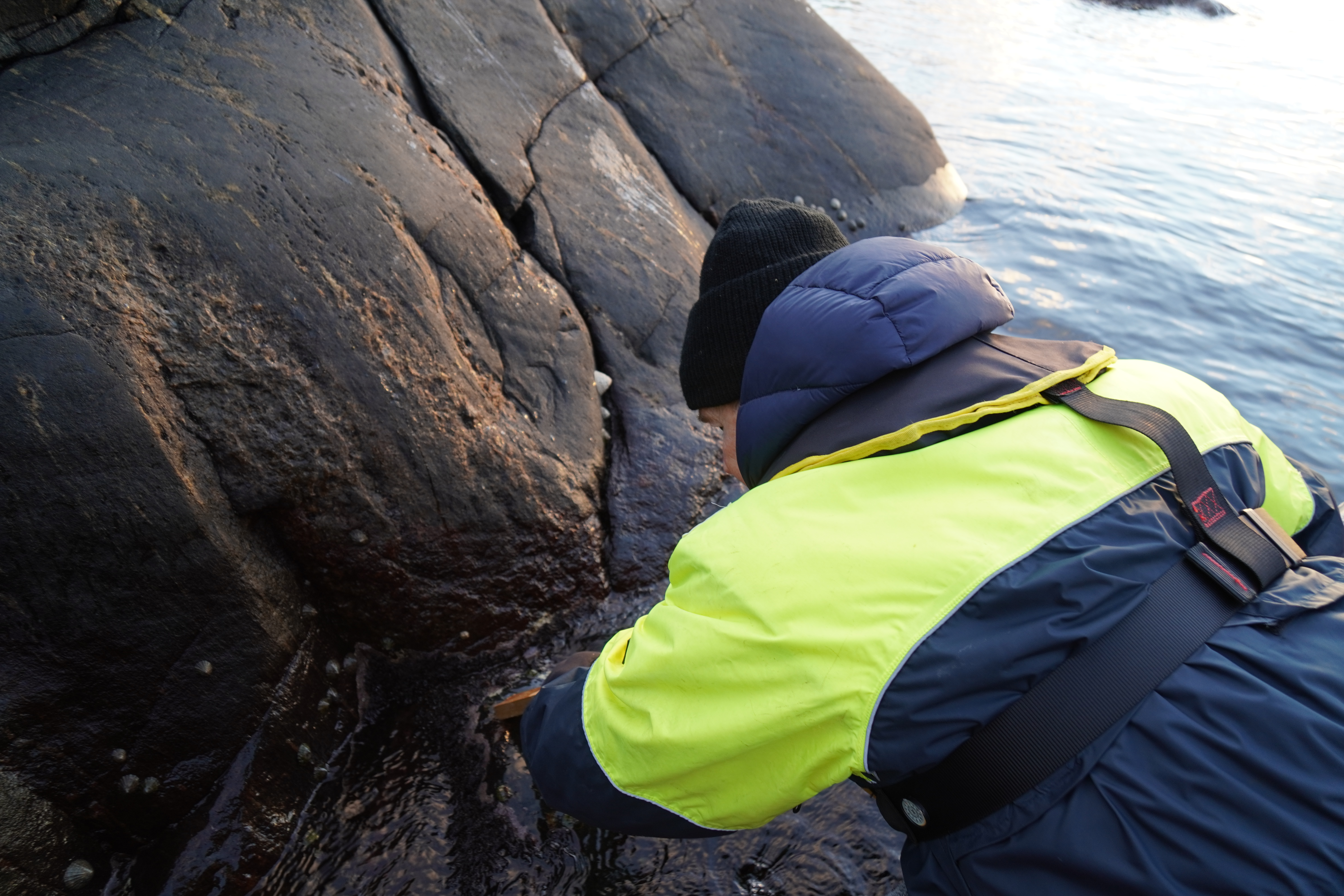 Med seg denne dagen, har han en kraftig hammer og en bøtte. Han leter etter glatte svaberg, hvor albuesneglen typisk kan finne mat. Jelmert henger over rekka og kakker dem løs, en etter en.