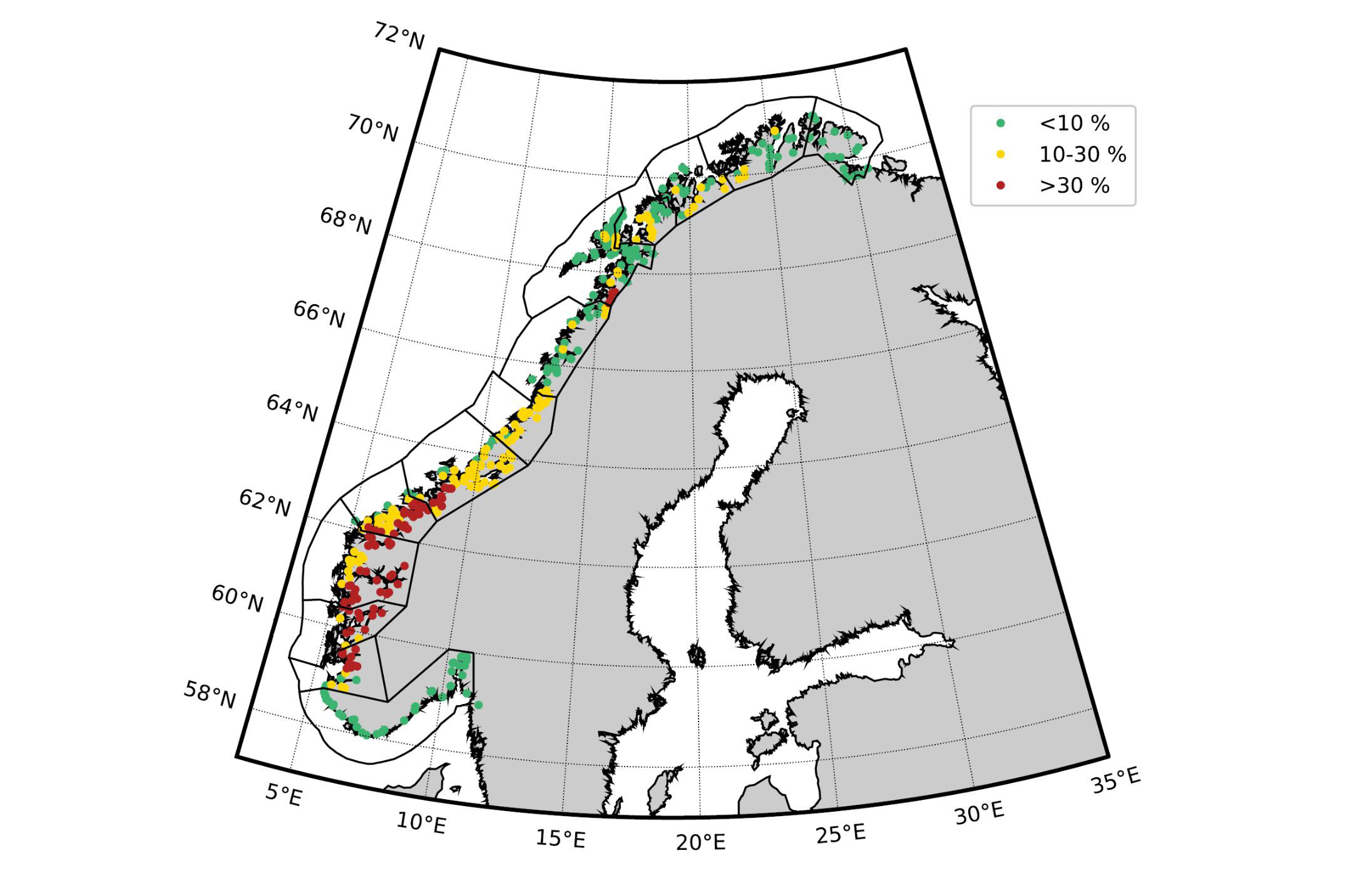 Ifølge den nye modellen er påvirkningen størst på fisk fra elvene på Vestlandet.