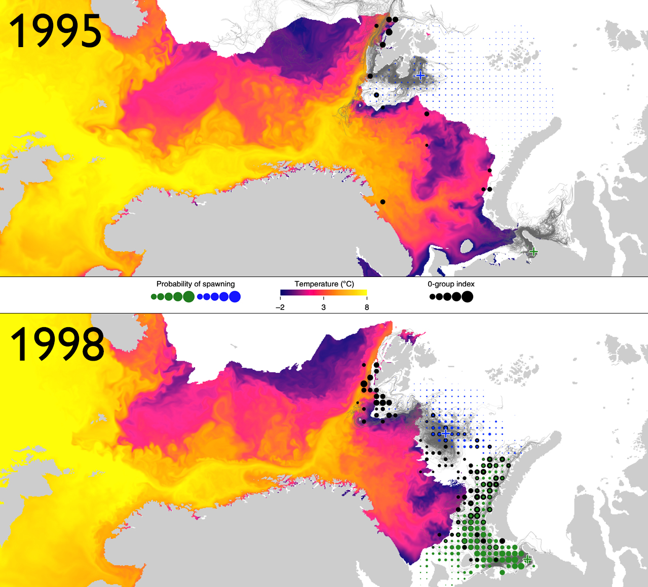 Slik har forskarane sett korleis gytefelta nordvest og søraust i Barentshavet har variert og flytta seg frå år til år.