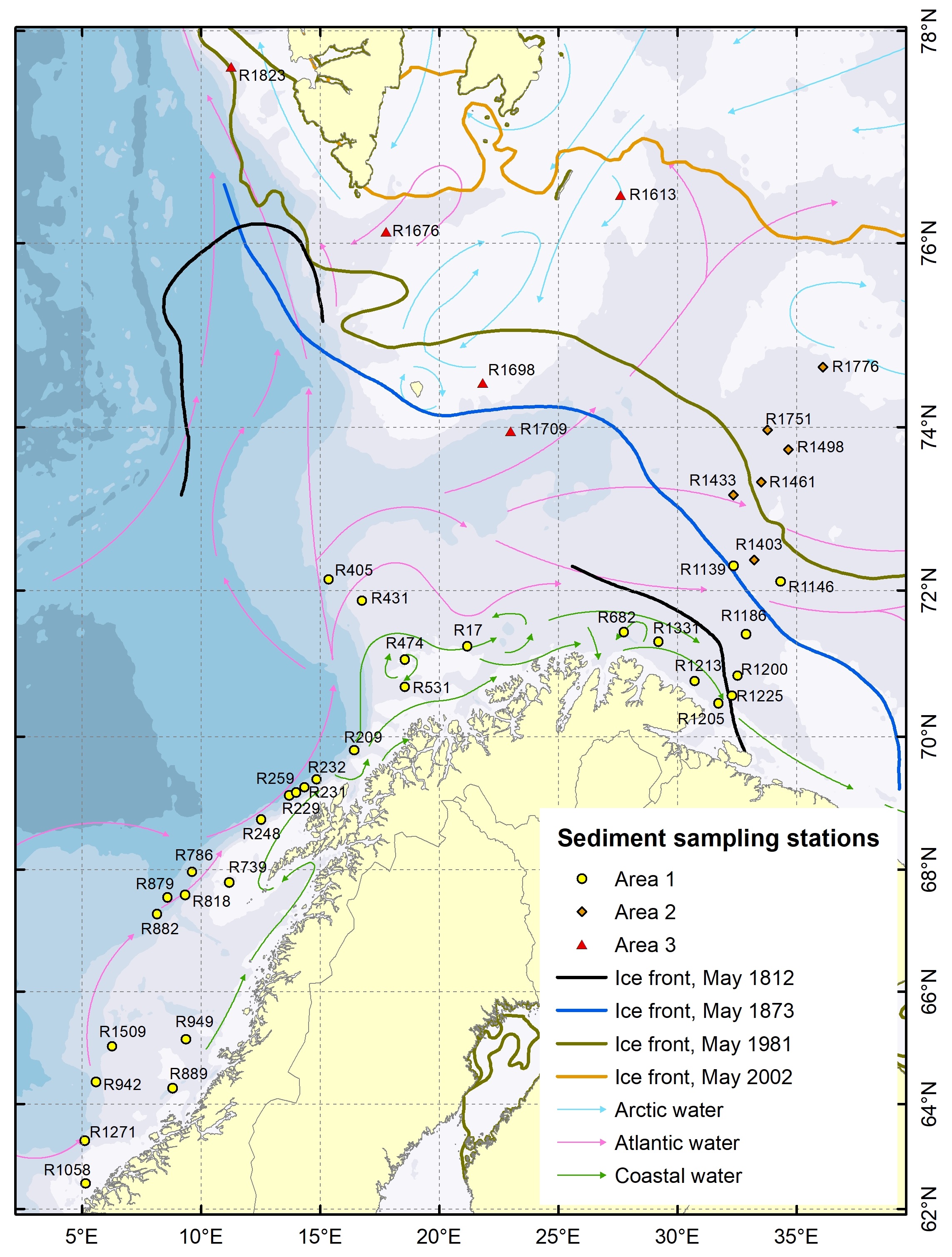– Dette gjør at det er litt høyere bakgrunnsnivåer her enn i andre deler av de undersøkte områdene. Nivåene kan også bli påvirket av klimaendringene når iskanten flytter lenger og lenger nord, forklarer forskeren. Kartet viser historiske iskanter fra forskjellige tider de siste 200 årene.