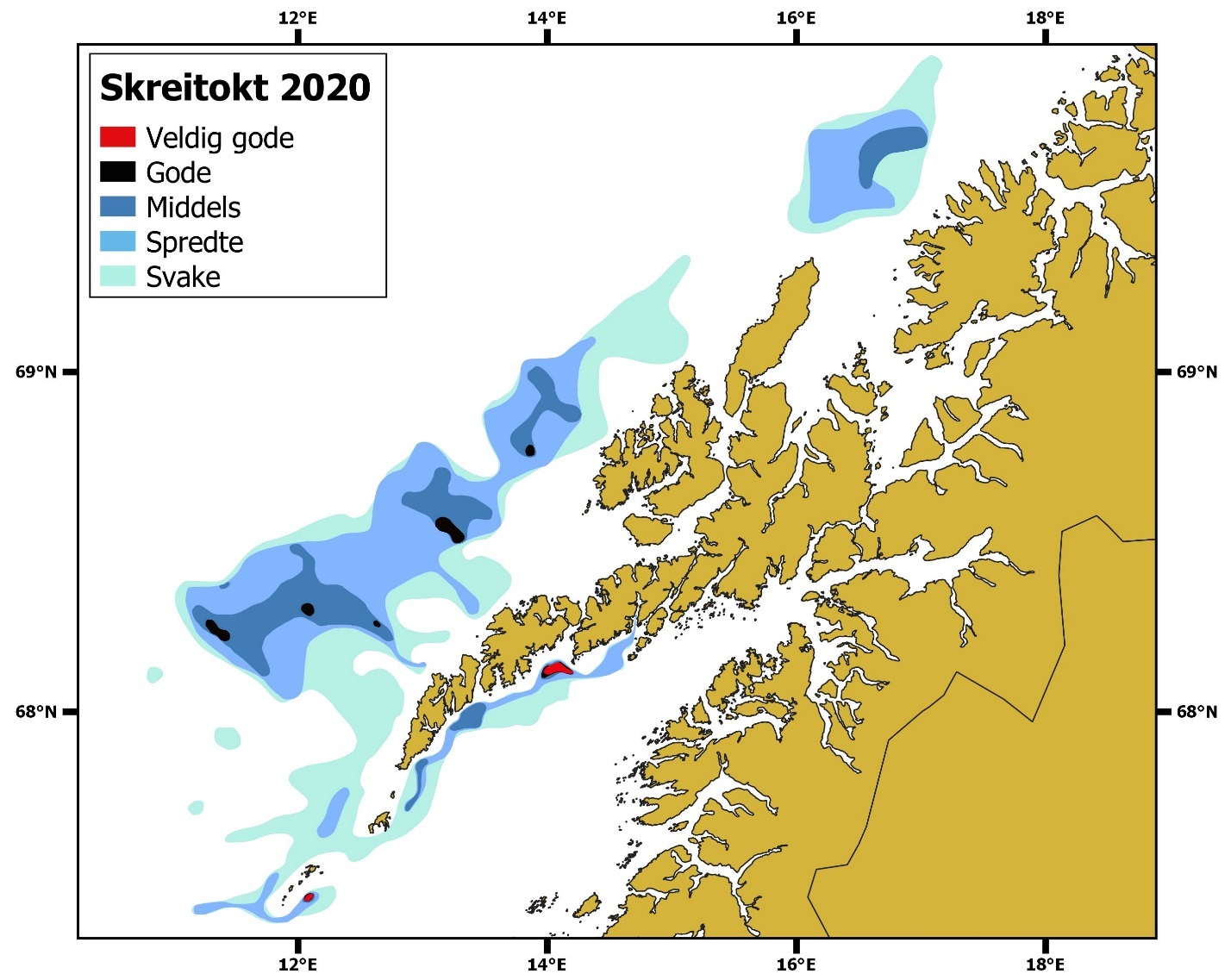 Knut Korsbrekke og Anders Thorsen (2020)."Skreitokt 2020 - Kartlegging av gytebestanden av skrei 2020". Rapport fra Havforskningen 2020-32. Lenke:https://www.hi.no/hi/nettrapporter/rapport-fra-havforskningen-2020-32