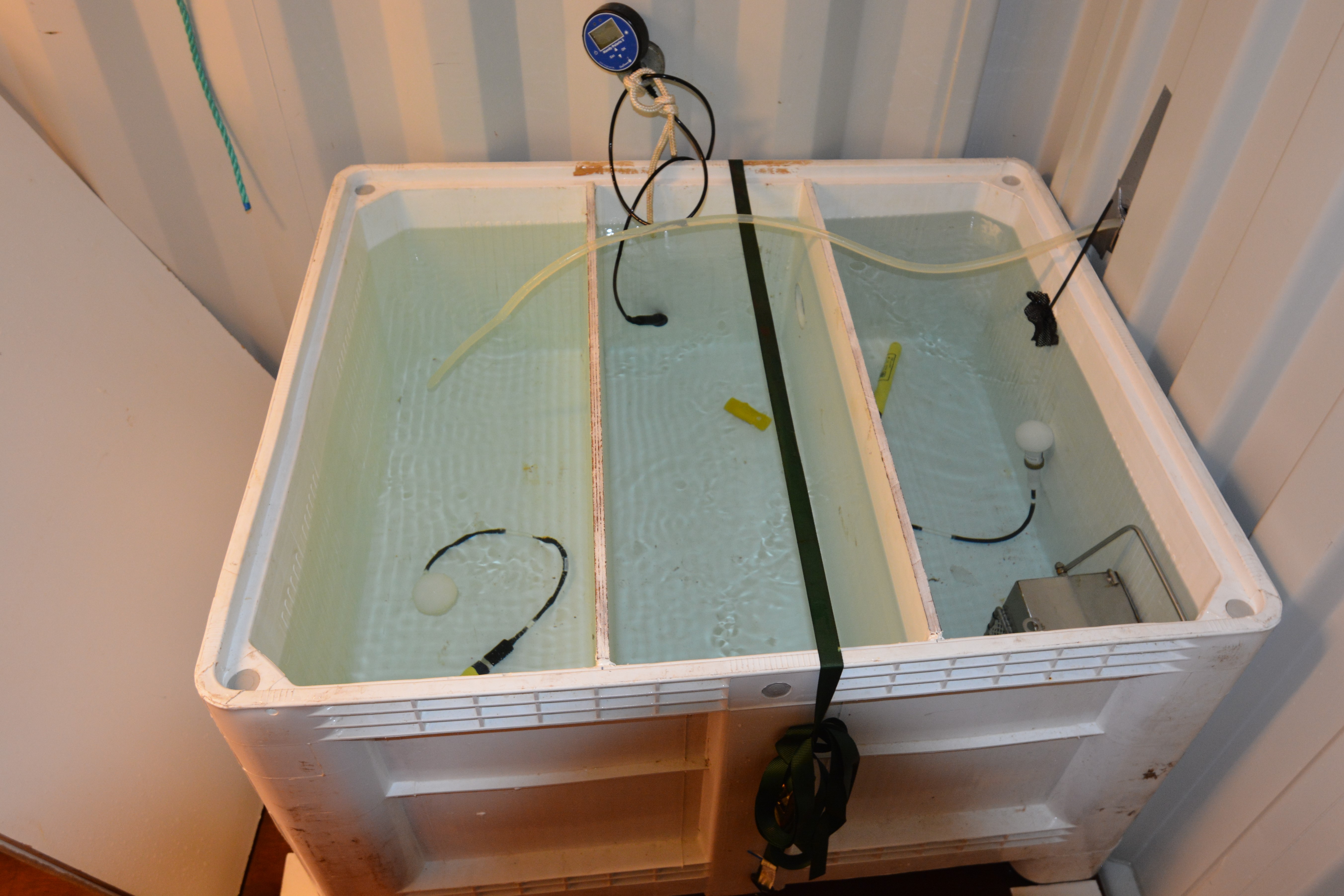 Om bord på skipet rigga forskarane seg til med vasstankar, pumper, slangar og sensorar til å overvake vasskvaliteten – alt plassert inne i ein lystett stålcontainer som blei sveisa fast i tråldekket.