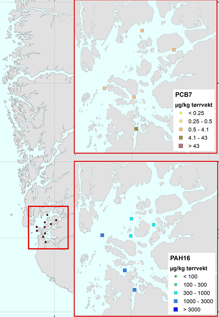 Resultatene fra kartleggingen av organiske miljøgifter viser også generelt gode miljøforhold. Polysykliske aromatiske hydrokarboner (PAH) forekommer naturlig i miljøet, men det er nivåer over det naturlige bakgrunnsnivået som kan tyde på noe menneskeskapt forurensning. Nivåene av PAH16 ligger overalt innenfor god tilstand, ifølge Miljødirektoratets klassifisering. De fleste andre organiske miljøgifter er menneskeskapt og forekommer ikke i naturen. Pesticider ligger meget lavt, mens det er noe mer variasjon i nivåene av PCB, bromerte flammehemmere (PBDE) og nye miljøgifter (PFAS).